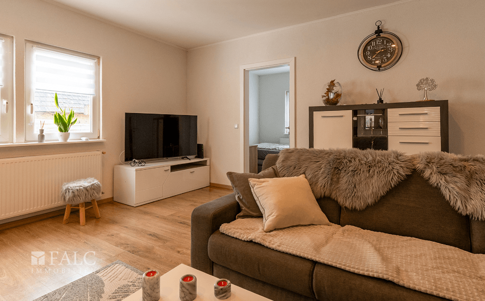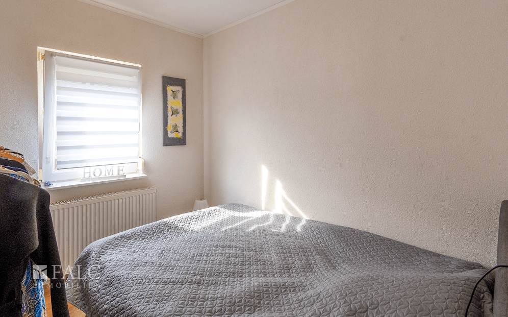 Die Immobilie verfügt über eine Wohnfläche von 90 m² und eine praktische Raumaufteilung mit drei Schlafzimmern. Die Innenräume lassen sich flexibel gestalten: Zwei der drei Zimmer können durch das Entfernen einer Trennwand leicht zu einem größeren Raum zusammengelegt werden, wodurch der neue Eigentümer einen großzügigeren Wohnbereich schaffen kann.