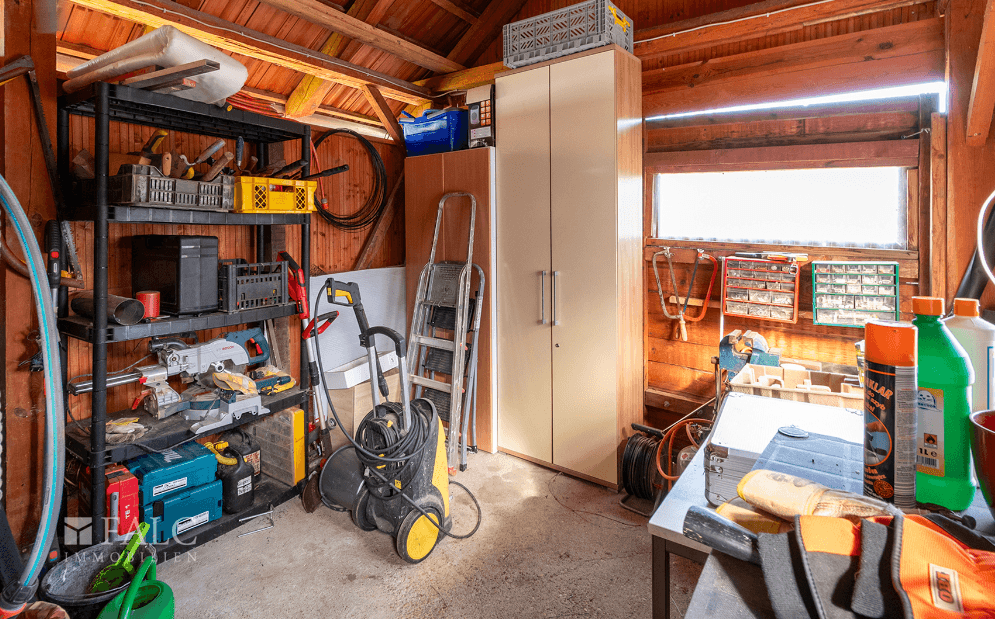 Auf dem Grundstück befinden sich außerdem mehrere praktische Nebengebäude: drei separate Lagerräume sowie ein offener Holzlagerplatz. Die eingebauten Möbel sind im Kaufpreis enthalten, sodass die Immobilie kurzfristig bezogen werden kann.
