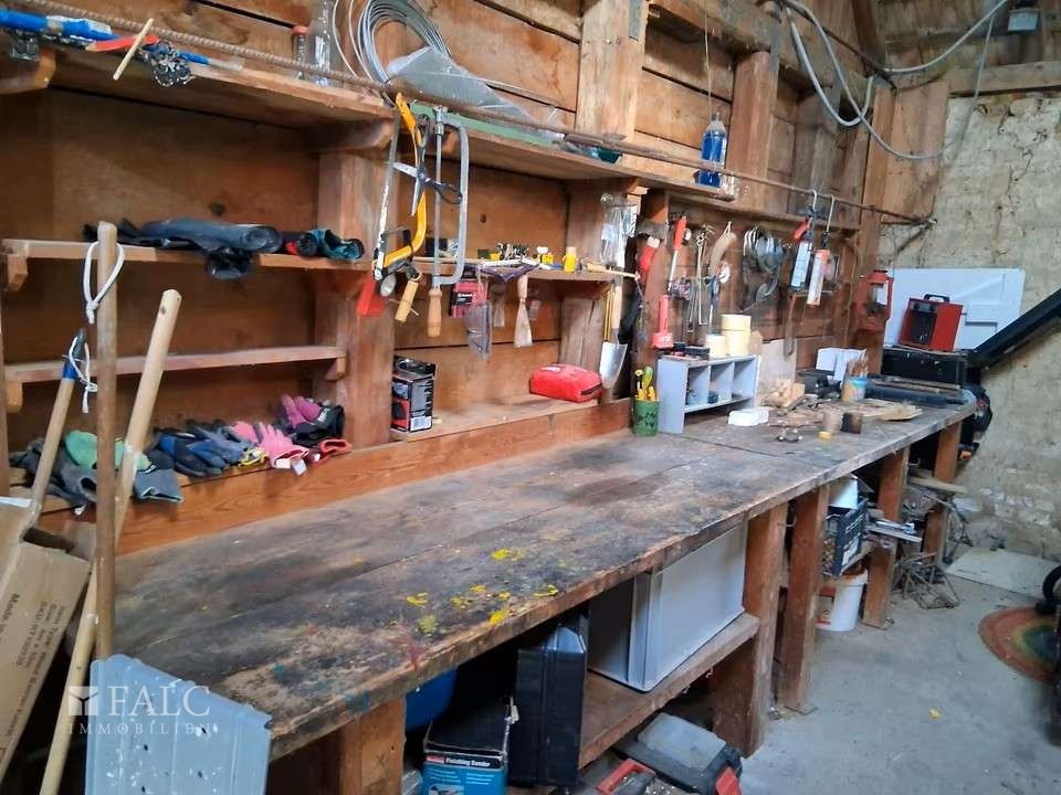 Werkstatt mit Werkbank, Regalen und Dachboden