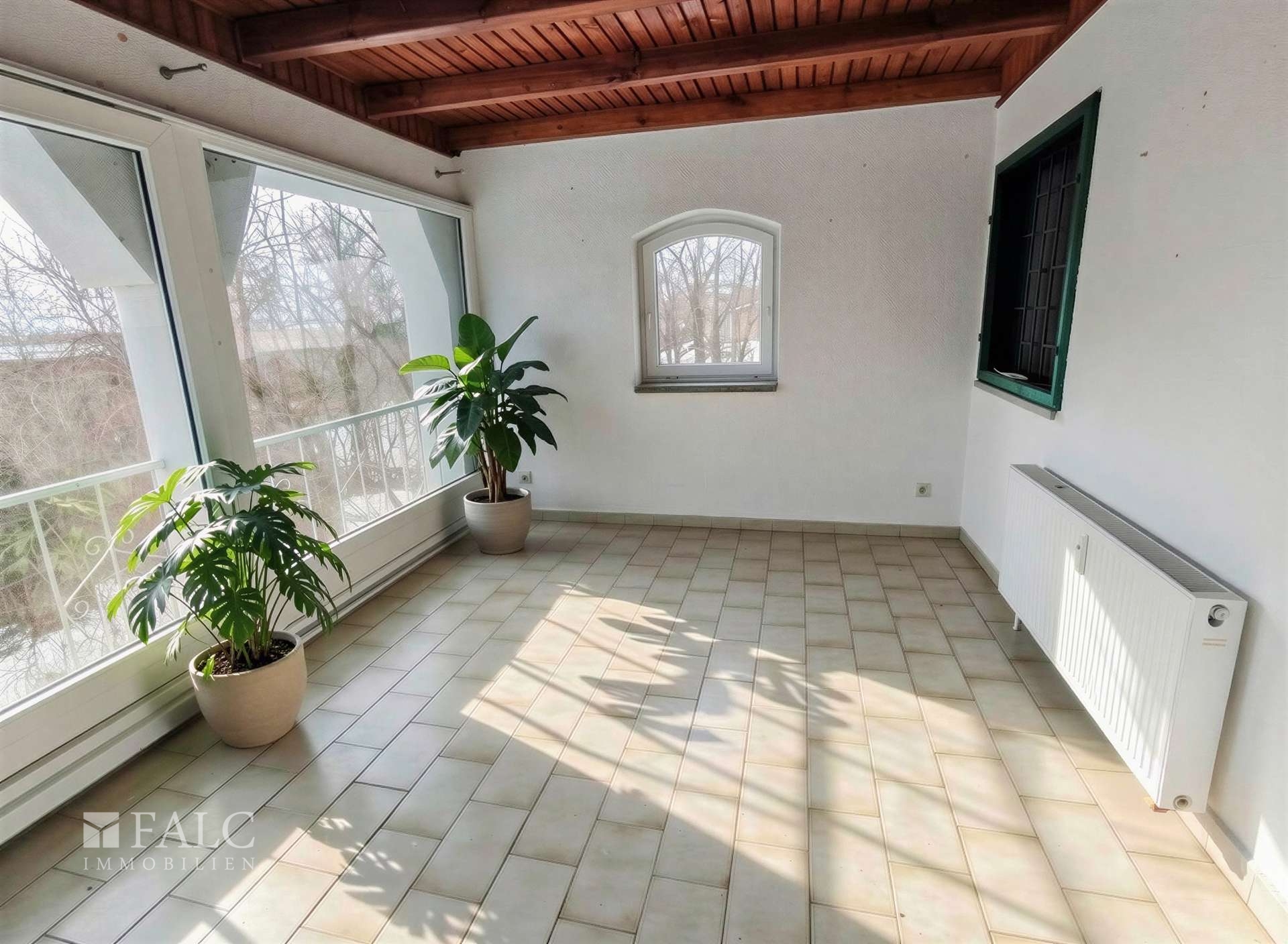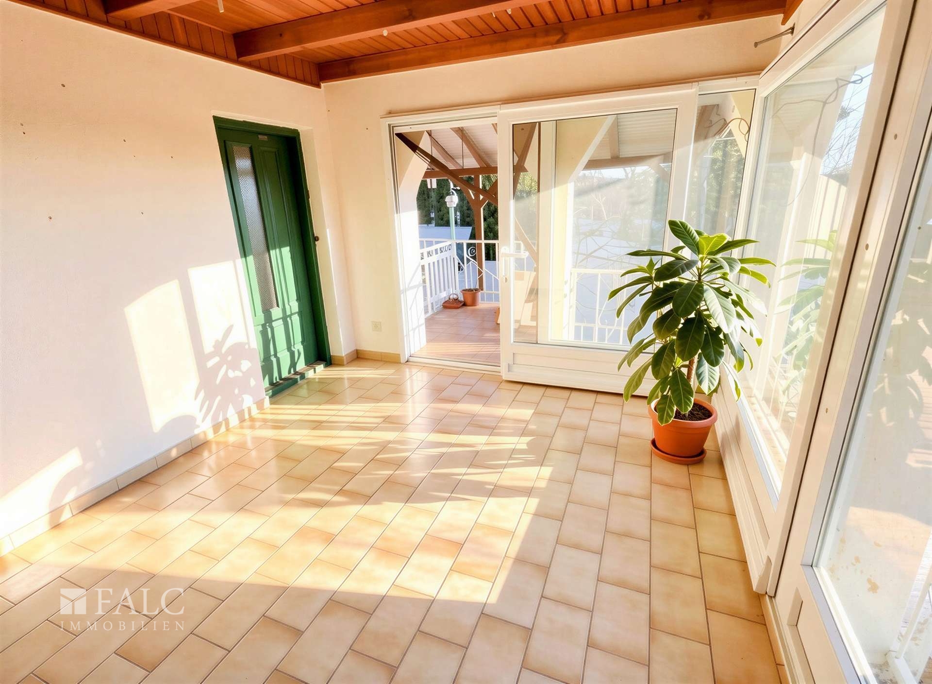Vor dem Haus befindet sich eine große Terrasse, ebenerdig betritt man das Haus über den gemütlichen Wintergarten und gelangt dann in den Wohnbereich.