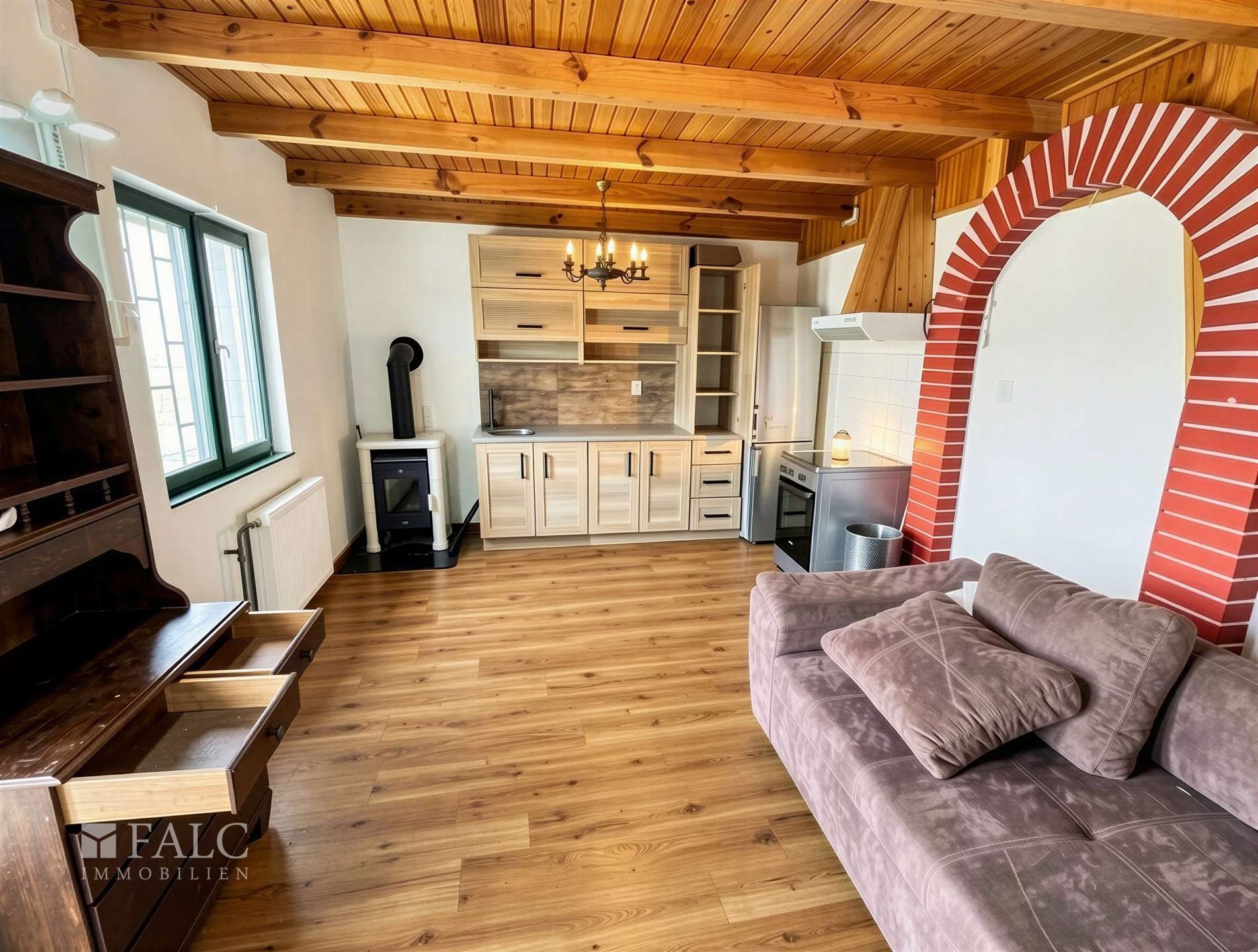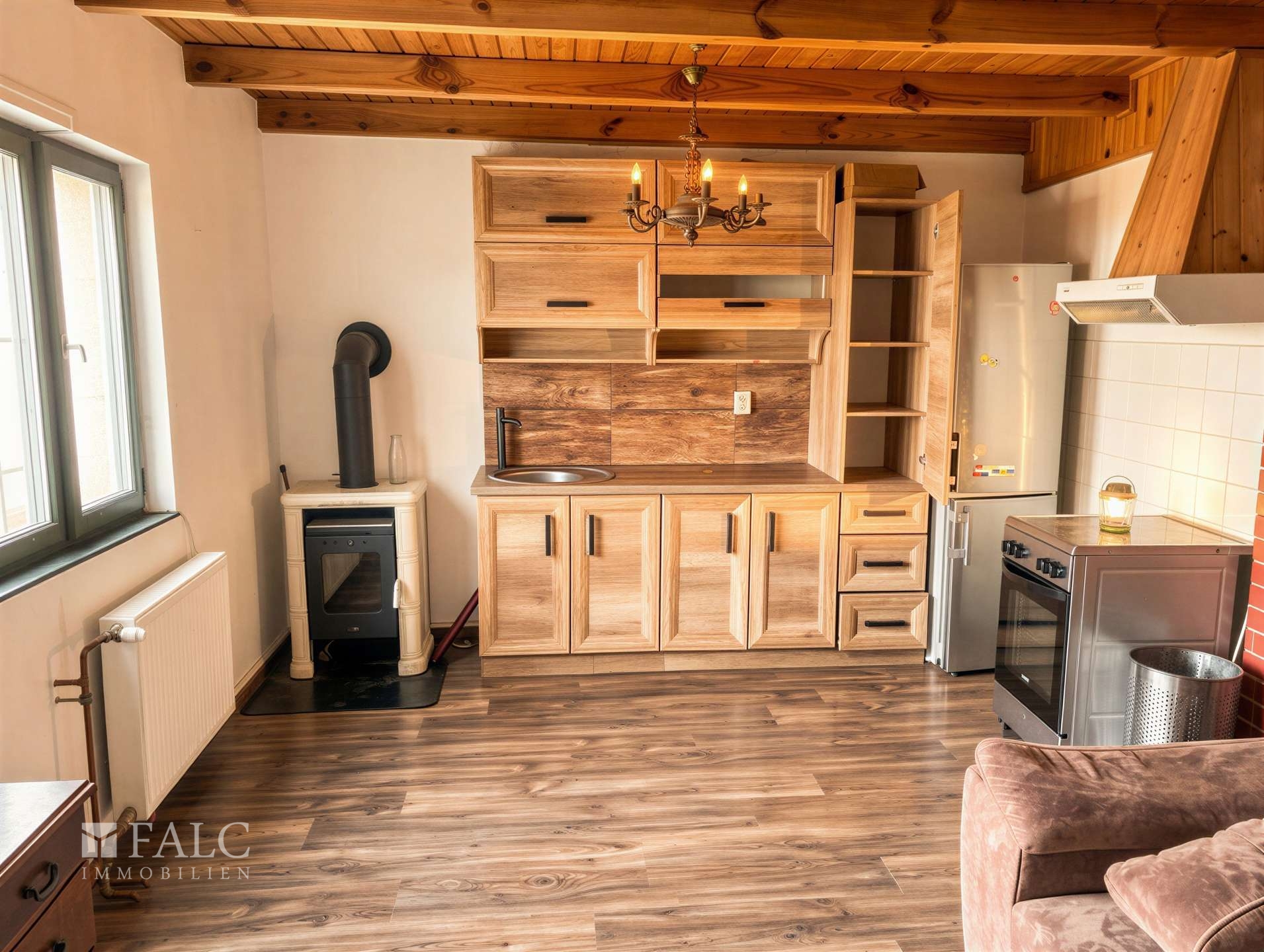 Dort befindet sich dann links auch die Küchenzeile und ein schöner Holzofen.