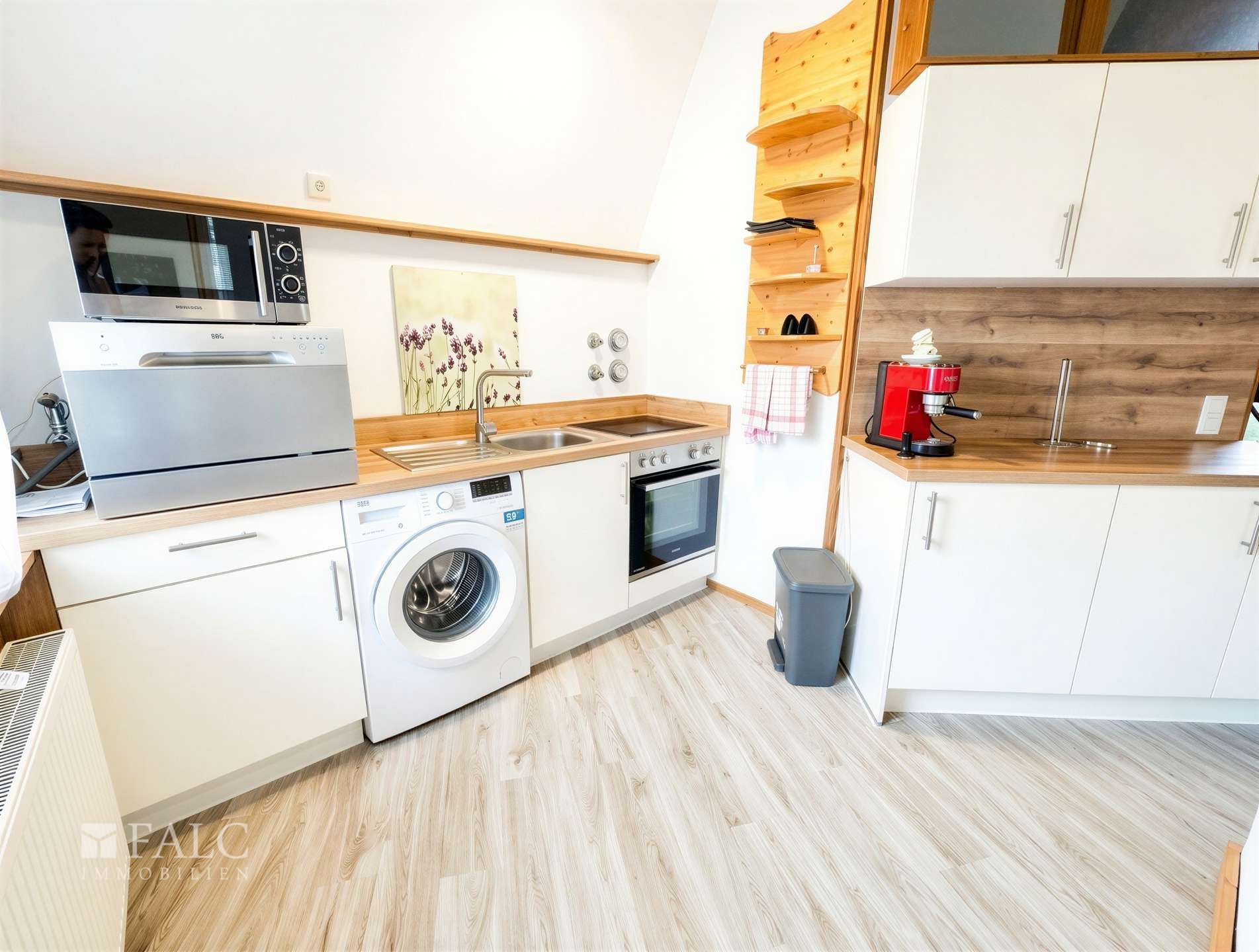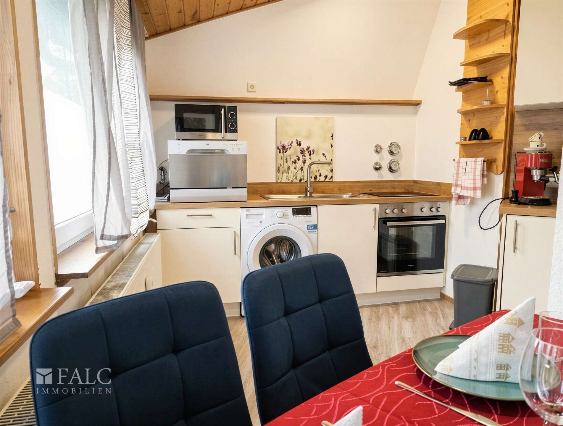 Die Küche fügt sich harmonisch ein und ist vollständig ausgestattet mit allem was benötigt wird. Ein Kühlschrank mit Gefrierfach, ein Herd sowie eine kompakte Tisch-Spülmaschine stehen bereit – perfekt für den Alltag oder kreative Kochmomente. Sämtliche Küchenutensilien wie Gläser, Besteck und Töpfe sind ebenfalls vorhanden und können übernommen werden.