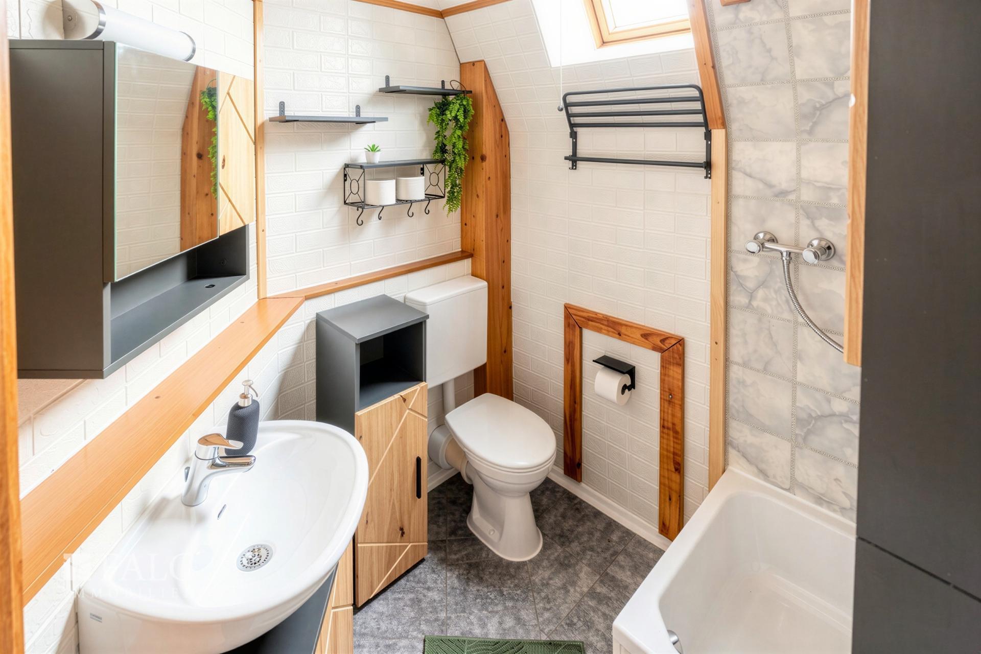 Das modernisierte Badezimmer verfügt über eine Dusche und ein WC sowie Badezimmer-Mobiliar.