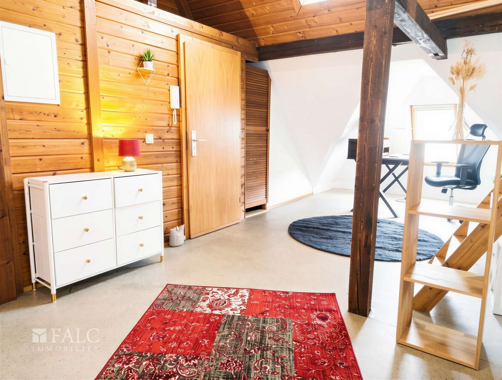 Der Schlafbereich ist clever auf einer Galerie integriert und bietet eine ruhige Rückzugsmöglichkeit. Somit ist die Wohnung aufgeräumt und der Schlafbereich für Gäste nicht einsehbar. Ein Bett sowie ausreichend Stauraum sorgen dafür, dass Sie sich vom ersten Tag an wie zu Hause fühlen.