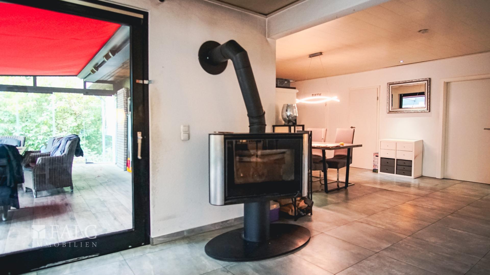 Im Essbereich und im Wohnraum sorgt ein gemütlicher Holzofen für angenehme Wärme und eine behagliche Atmosphäre. Durch die offene Raumgestaltung mit den großen Fenstern haben Sie hier eine wunderbare Aussicht in den Garten.