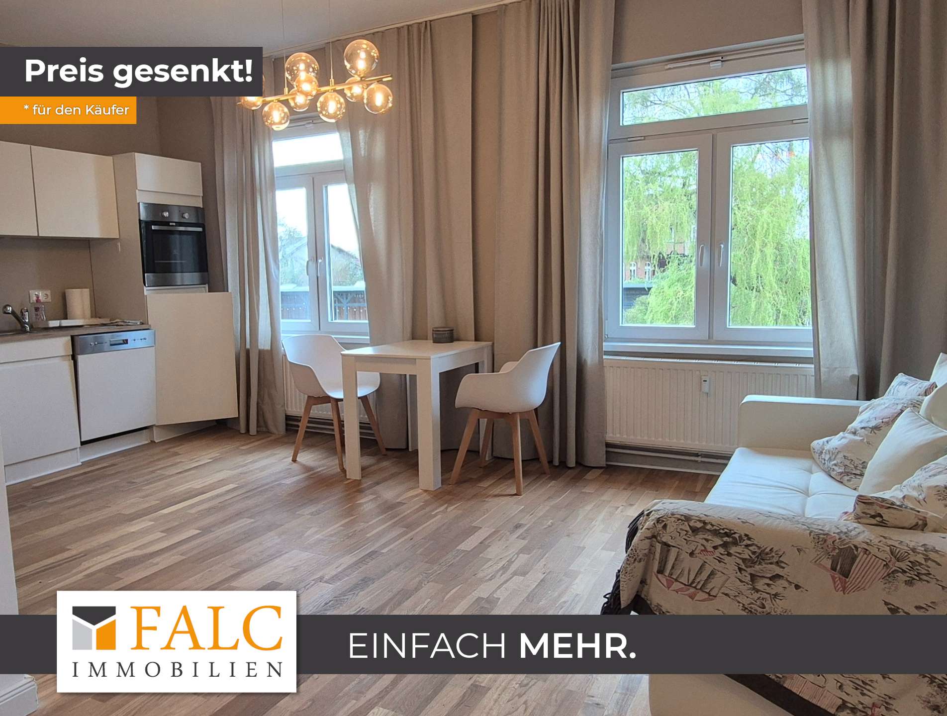 Auf 43 m² Wohnfläche befindet sich im Wohnraum ein modern gestalteter Kücheneinbau mit hochwertigen Elektrogeräten und einer Eichenholzarbeitsplatte. Die Räume sind mit Echtholzparkett und im Badezimmer mit Fliesen ausgelegt. Das Bad ist mit einer Eckdusche und stilvollen Fliesen modern gestaltet.