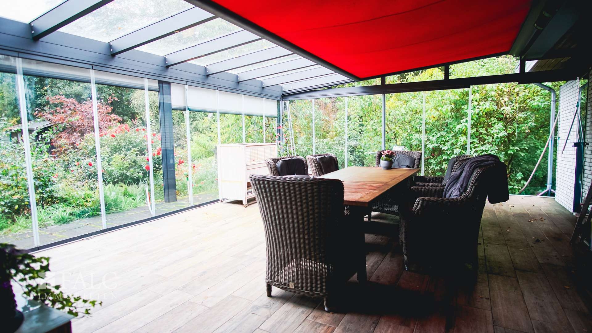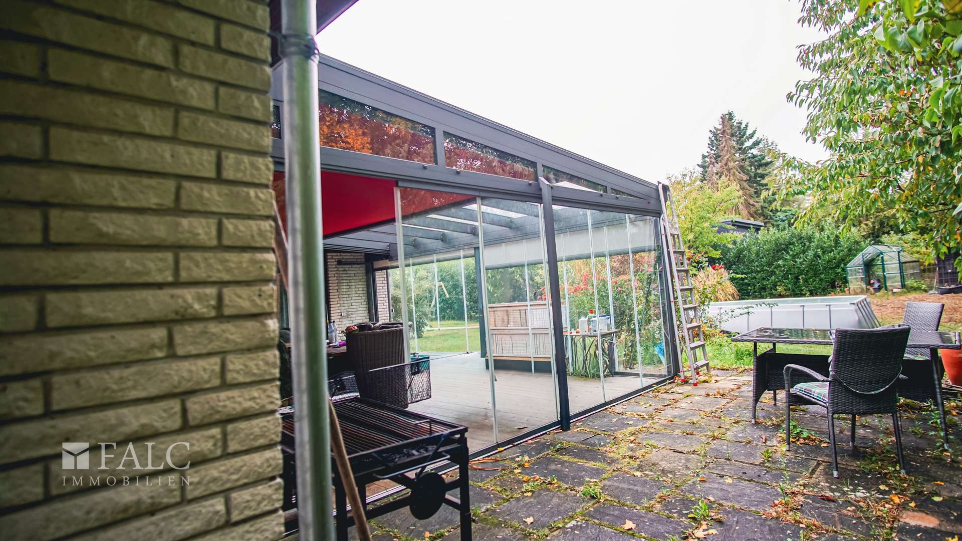 Ein großer Wintergarten ergänzt die Wohnfläche zum Garten hin. Hier ist eine Dachmarkise verbaut, die auch bei Sonneneinstrahlung Schutz bietet.