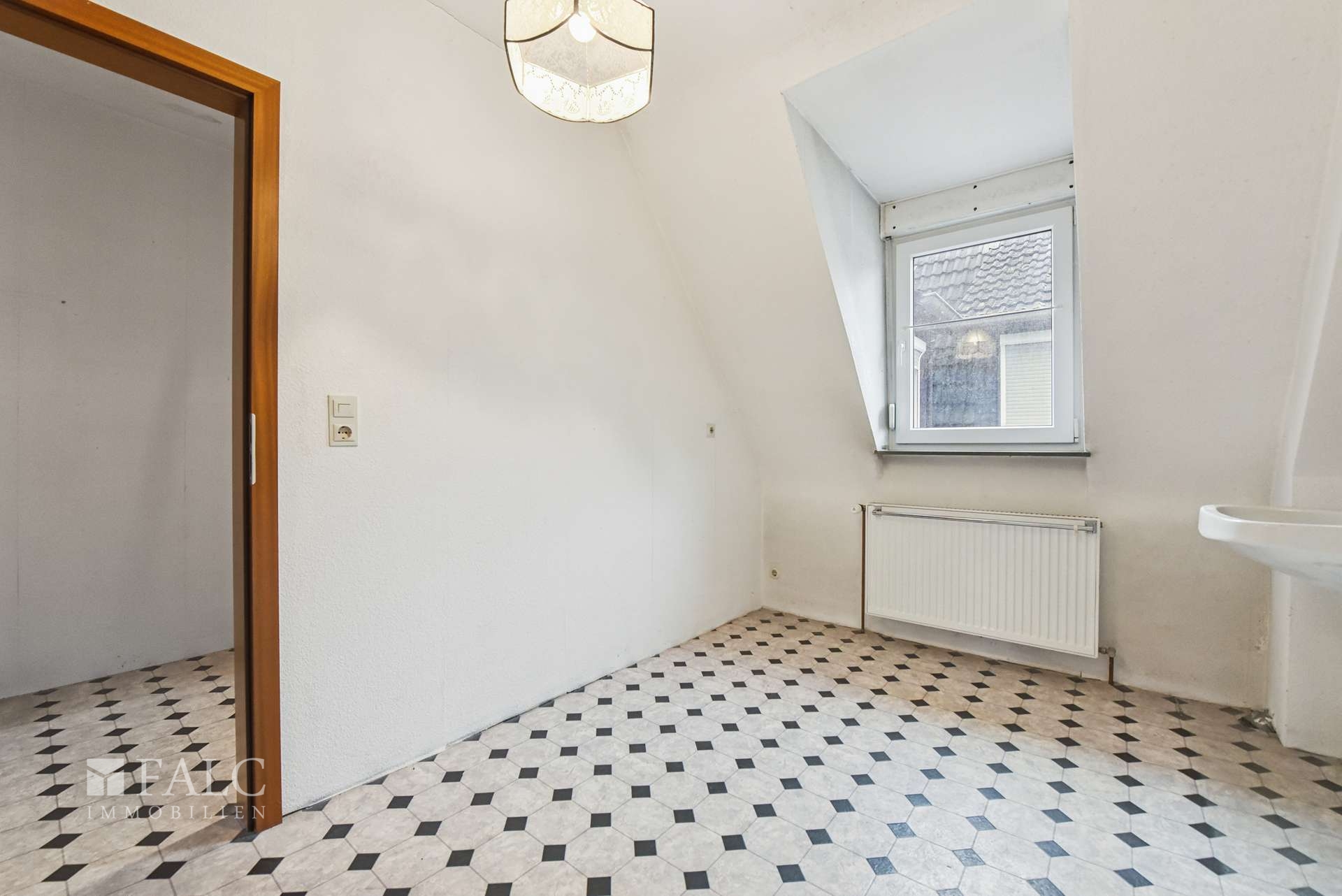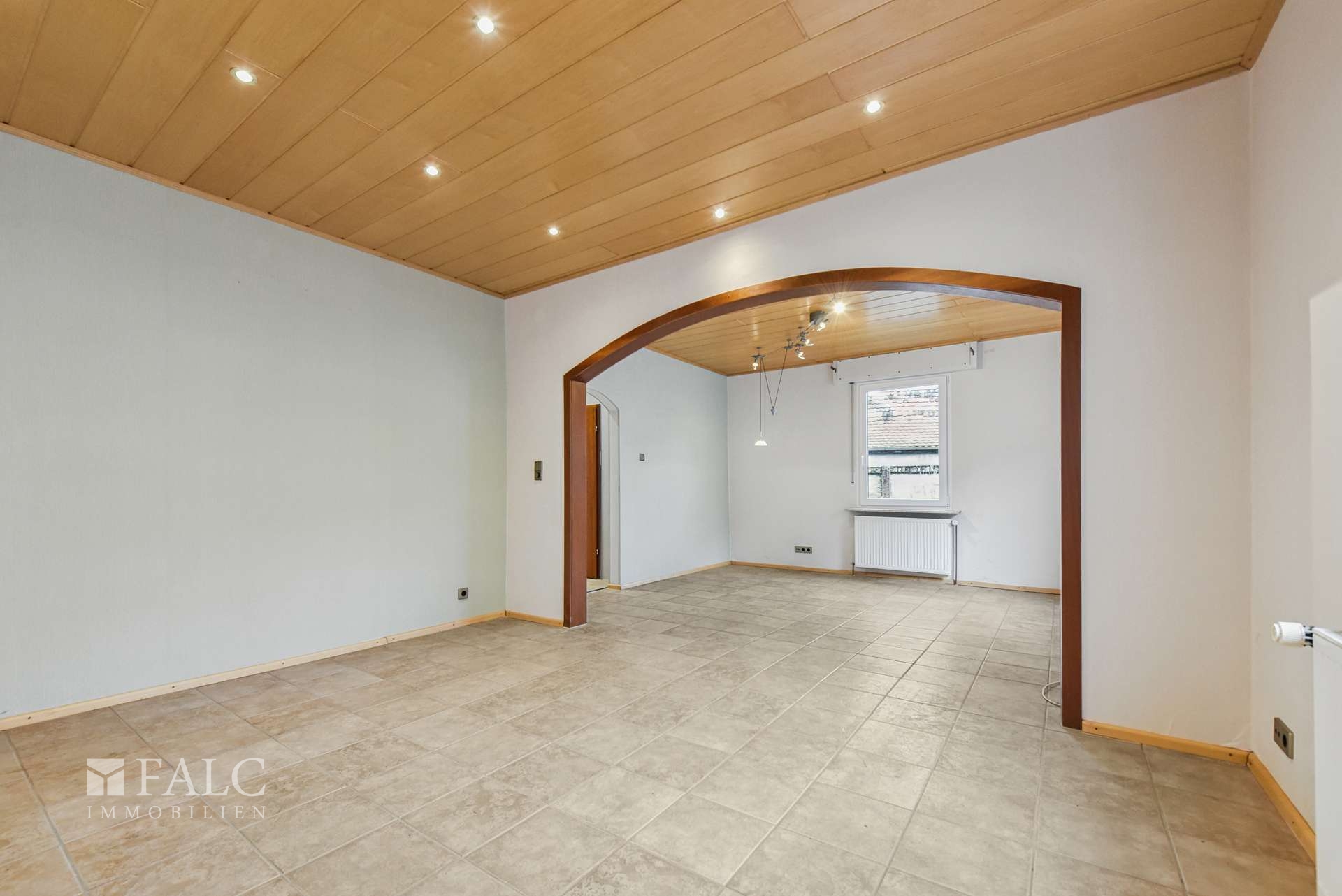 Im Erdgeschoss gelangen Sie über einen kleinen Flur in die Wohnräume. Die Küche können Sie nach Ihren eigenen Vorstellungen und Wünschen planen und einbauen lassen. Das hell geflieste Tageslichtbad aus dem Jahr 2000 verfügt über eine ebenerdige Dusche und eine Badewanne. Eine kleine Abstellkammer bietet zusätzlichen Stauraum, der große Wohn- und Essbereich überzeugt mit viel Helligkeit.