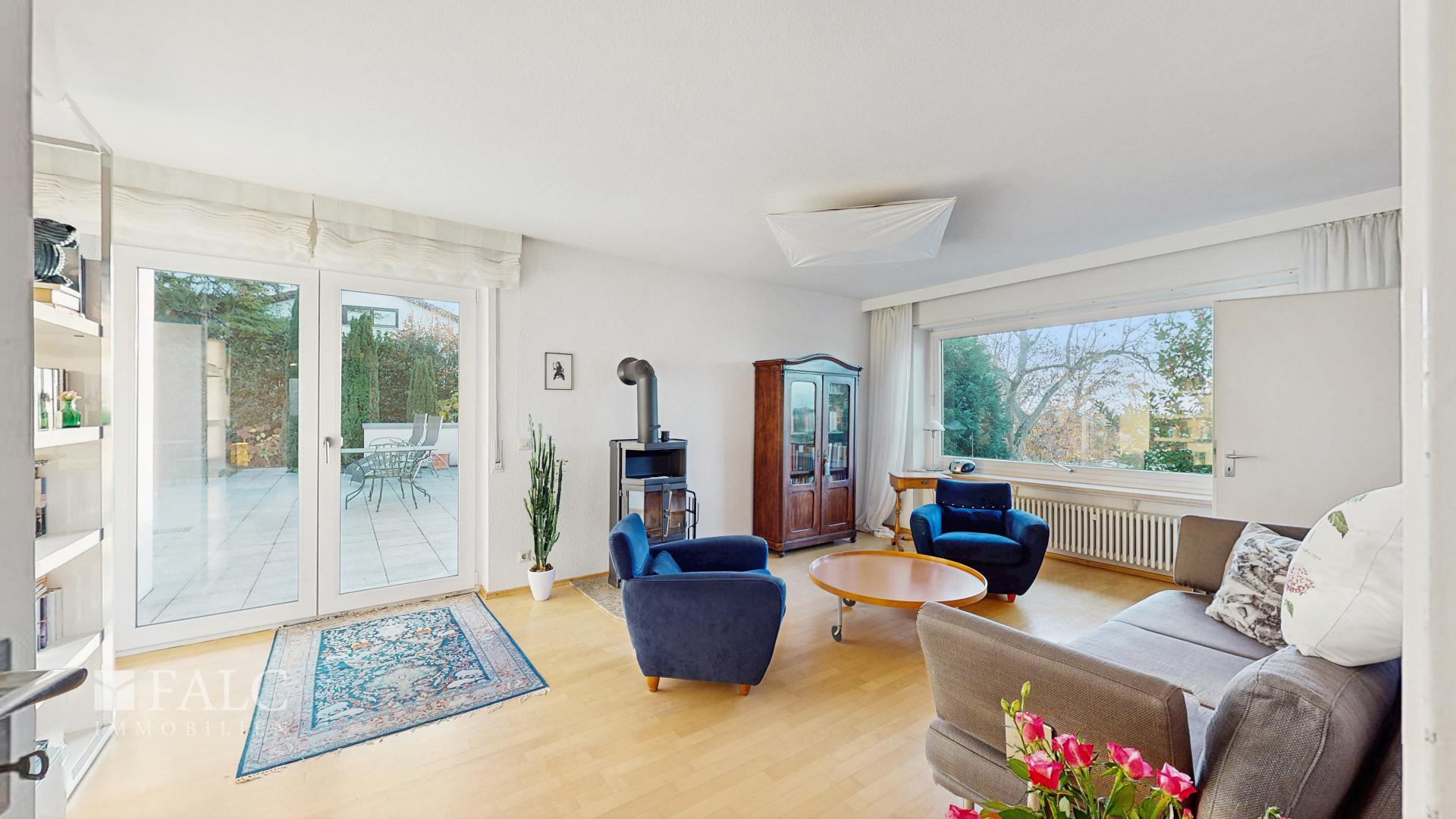 Vom Wohnzimmer gelangen Sie auf eine große Südwest-Terrasse (58 m²) mit direktem Zugang zum wunderschön angelegten Garten. Dort können Sie Ihrer Kreativität freien Lauf lassen und sich einen Ort der Erholung gestalten.