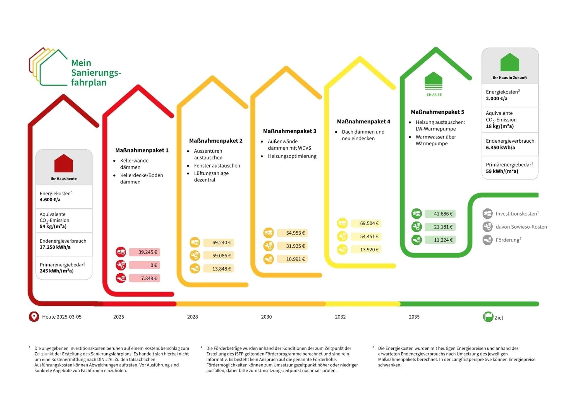 Um das Objekt energetisch auf den neuesten Stand zu bringen, haben wir für Sie einen Überblick über die dabei entstehenden geschätzten Kosten (ca. 275 T€, ohne Berücksichtigung von Fördermitteln) sowie mögliche Fördermittel (ca. 57 T€) von einem Energieeffizienzexperten erstellen lassen. Ein Schaubild zu den möglichen Maßnahmenpaketen finden Sie in den Bilddateien. Gerne stellen wir Ihnen den Sanierungsfahrplan und die empfohlenen Maßnahmen bei einem persönlichen Besichtigungstermin vor.