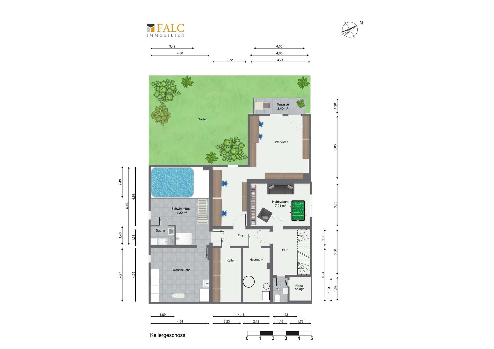 Eine Etage tiefer erwartet Sie ein großzügiger Kellerbereich mit Heizungsraum, Waschküche, einem Schwimmbad mit Gegenstromanlage und Sauna, Werkstatt mit Zugang zum Garten und kleiner Terrasse sowie einem separaten WC. Der ebenfalls auf dieser Etage befindliche Hobbyraum wurde ausgebaut und kann nicht als ständiger Aufenthaltsraum, aber z.B. als Hobbyraum oder Arbeitszimmer, genutzt werden. Der Hobbyraum, das Schwimmbad, der Balkon und die zwei Terrassen wurden jeweils zu 50 % bei der Wohnfläche berücksichtigt.