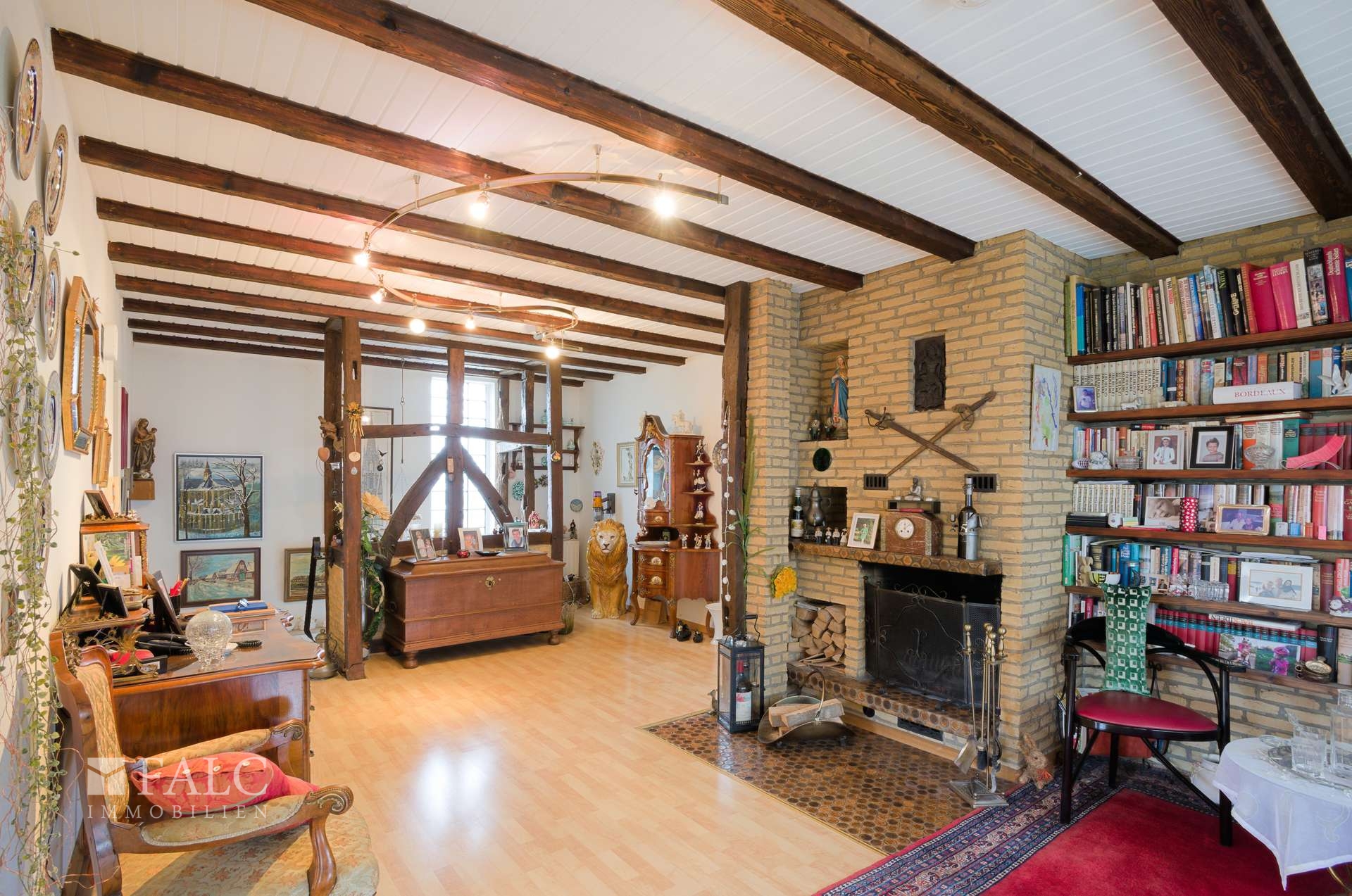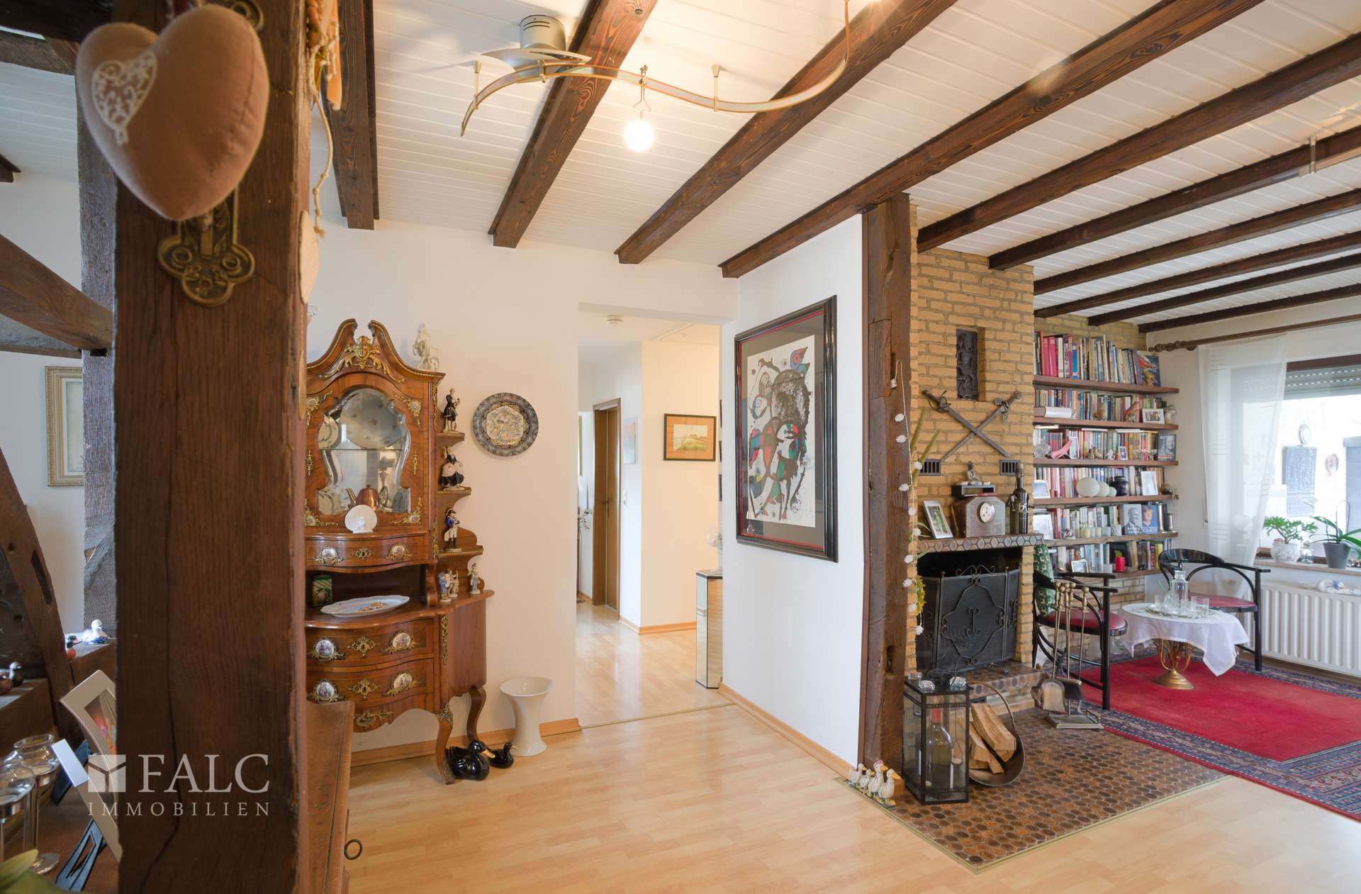 Das Haus ist in allen Bereichen gepflegt und vermittelt ein wohnliches, warmes Ambiente. Herzstück ist der großzügige Wohnbereich, der durch seine Aufteilung sowohl gesellige Momente als auch Rückzug ermöglicht. Ein echtes Highlight bildet das Kaminzimmer: Sichtbare Holzbalken, die gemauerte Kaminanlage und der charaktervolle Stil schaffen eine Atmosphäre, die man sofort spürt und ideal für gemütliche Abende, Familienzeit oder Gäste ist. Der angrenzende Essbereich wirkt offen und einladend und bietet ausreichend Platz für einen großen Esstisch. Die Küche ist mit einer Einbauküche ausgestattet und überzeugt durch Funktionalität, Arbeitsfläche und Stauraum.