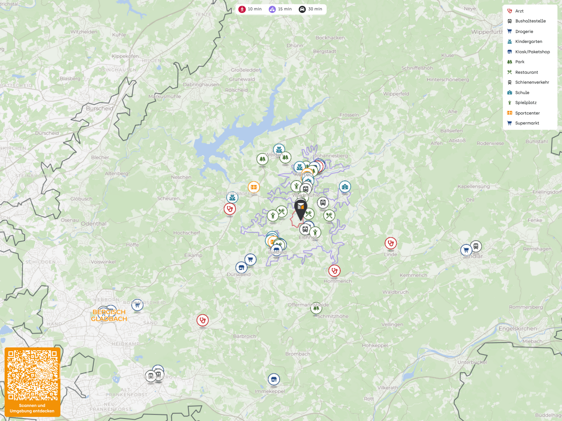 Die Anbindung ist vielseitig: Eine Bushaltestelle wie Breibacher Weg liegt in ca. 0,5 km Entfernung und unterstützt die Wege im Alltag. Ein eigener Bahnanschluss ist in Kürten nicht vorhanden, der nächstgelegene Bahnhof befindet sich in Bergisch Gladbach in ca. 11 km Entfernung. Die Autobahnen A1, A3 und A4 sind je nach Route in etwa 15 bis 30 Minuten erreichbar. Der nächstgelegene Flughafen ist Köln Bonn.