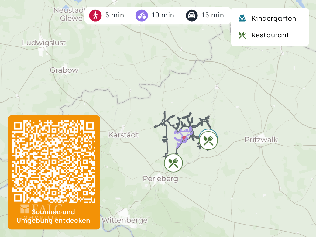 Als künftige Eigentümer genießen Sie einen schönen Fernblick auf das angrenzende Moor und profitieren von einer idyllischen, ruhigen Umgebung. Gleichzeitig bietet die nur 11 km entfernte Rolandstadt Perleberg eine umfassende Infrastruktur, so dass Sie alle Annehmlichkeiten einer Kleinstadt in kurzer Distanz erreichen.