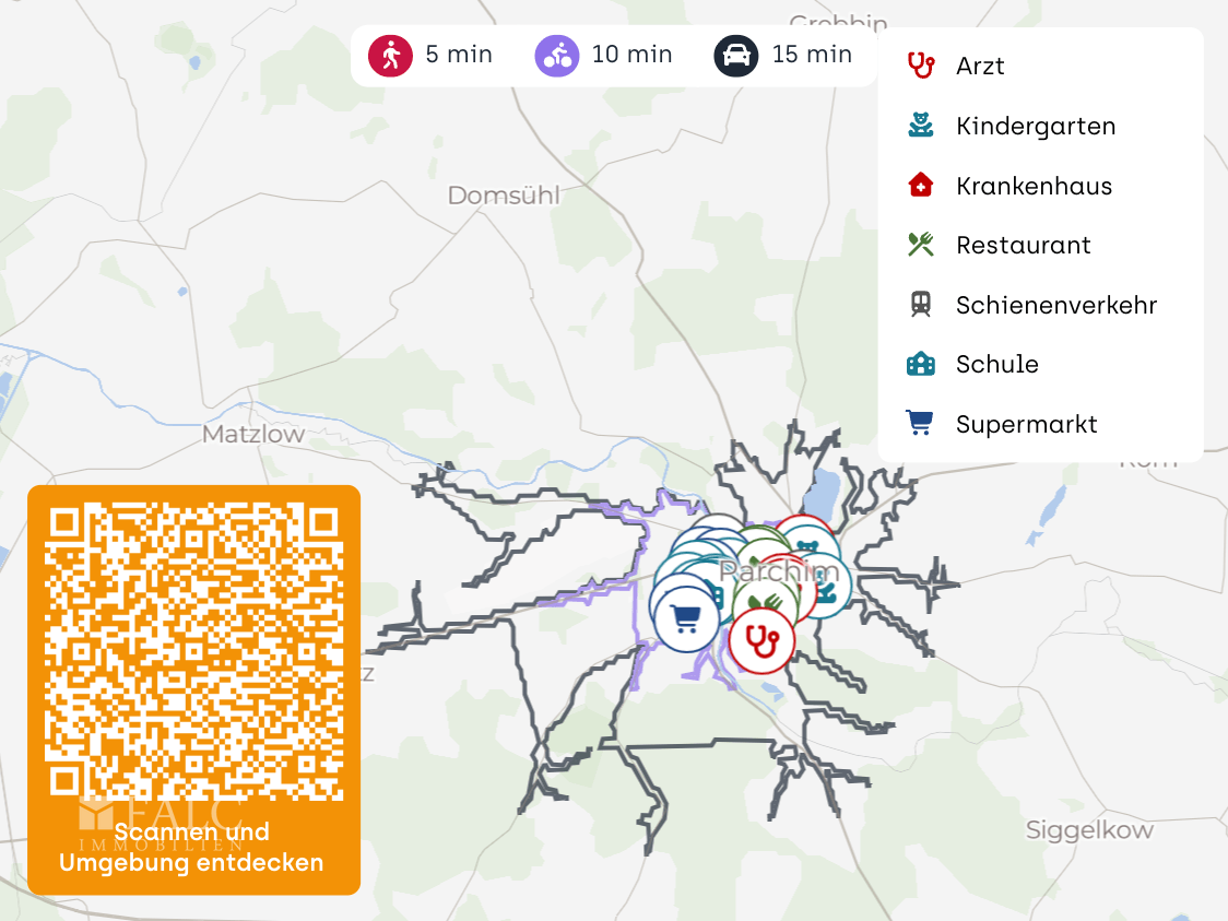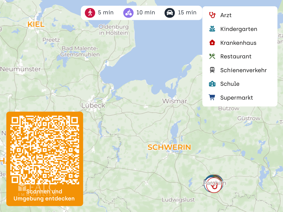 Die Wohnung liegt im Stadtteil Weststadt von Parchim, in fußläufiger Nähe zu Geschäften des täglichen Bedarfs, Apotheken und Nahversorgern. Die Anbindung an das städtische Verkehrsnetz ist solide — sowohl in Richtung Innenstadt als auch zu überregionalen Wegen.