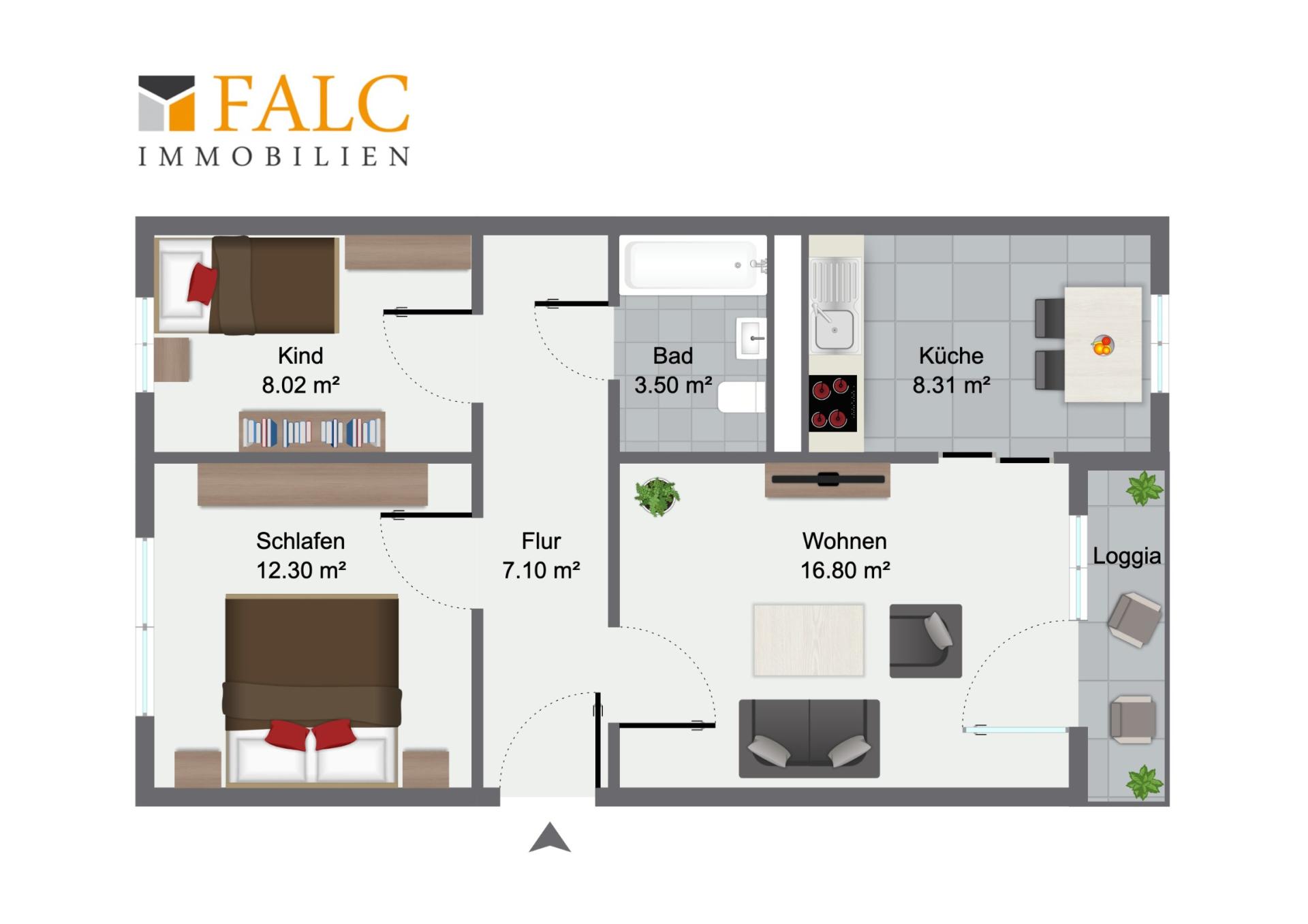 Die Wohnung bietet eine Wohnfläche von ca. 57 m² und befindet sich in der dritten Etage eines gepflegten Mehrfamilienhauses. Vom zentralen Flur aus gelangen Sie links in zwei Schlafräume – ein Schlafzimmer und ein Kinderzimmer – sowie rechts in das innenliegende Wannenbad.