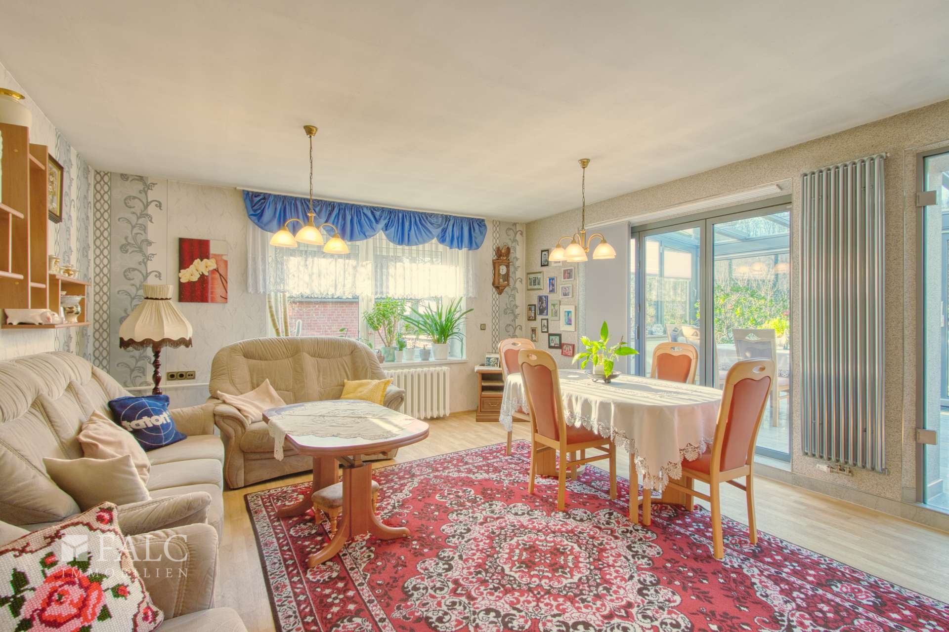 Sie betreten das Haus über einen funktionalen Eingangsbereich mit Platz für Garderobe und den Alltag. Von hier aus erschließt sich das Erdgeschoss in klarer Struktur. Herzstück ist der großzügige Wohn- und Essbereich mit viel Stellfläche für Sofa und Esstisch sowie großen Fensterflächen, die für angenehmes Tageslicht sorgen. Direkt angrenzend befindet sich der beheizte Wintergarten, der 2012 erneuert wurde. Eine elektrische Markise sorgt im Sommer für angenehme Beschattung. Von hier aus gelangen Sie auf die Terrasse und in den Garten – ein geschützter Bereich mit Raum zum Spielen, Gärtnern oder einfach zum Ankommen und Durchatmen.