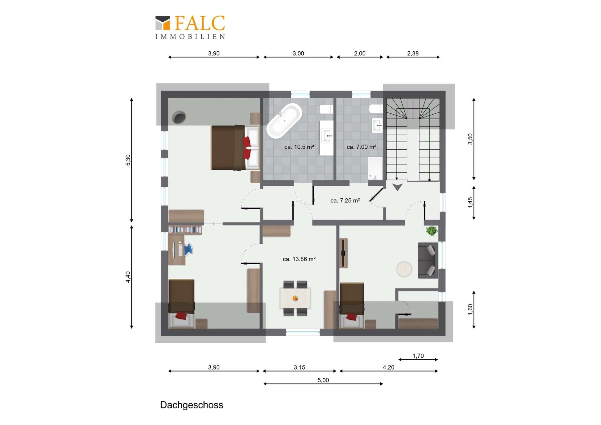 Über das weitläufige Treppenhaus erreichen Sie das Dachgeschoss. Hier stehen drei Schlafzimmer zur Verfügung, eines davon als Gästezimmer mit eigenem WC. Zwei weitere modern gestaltete Badezimmer bieten mit Dusche bzw. Badewanne und Tageslicht eine komfortable Ergänzung und der Wohnraum inklusive Kamin lässt auch hier keine Wünsche offen.