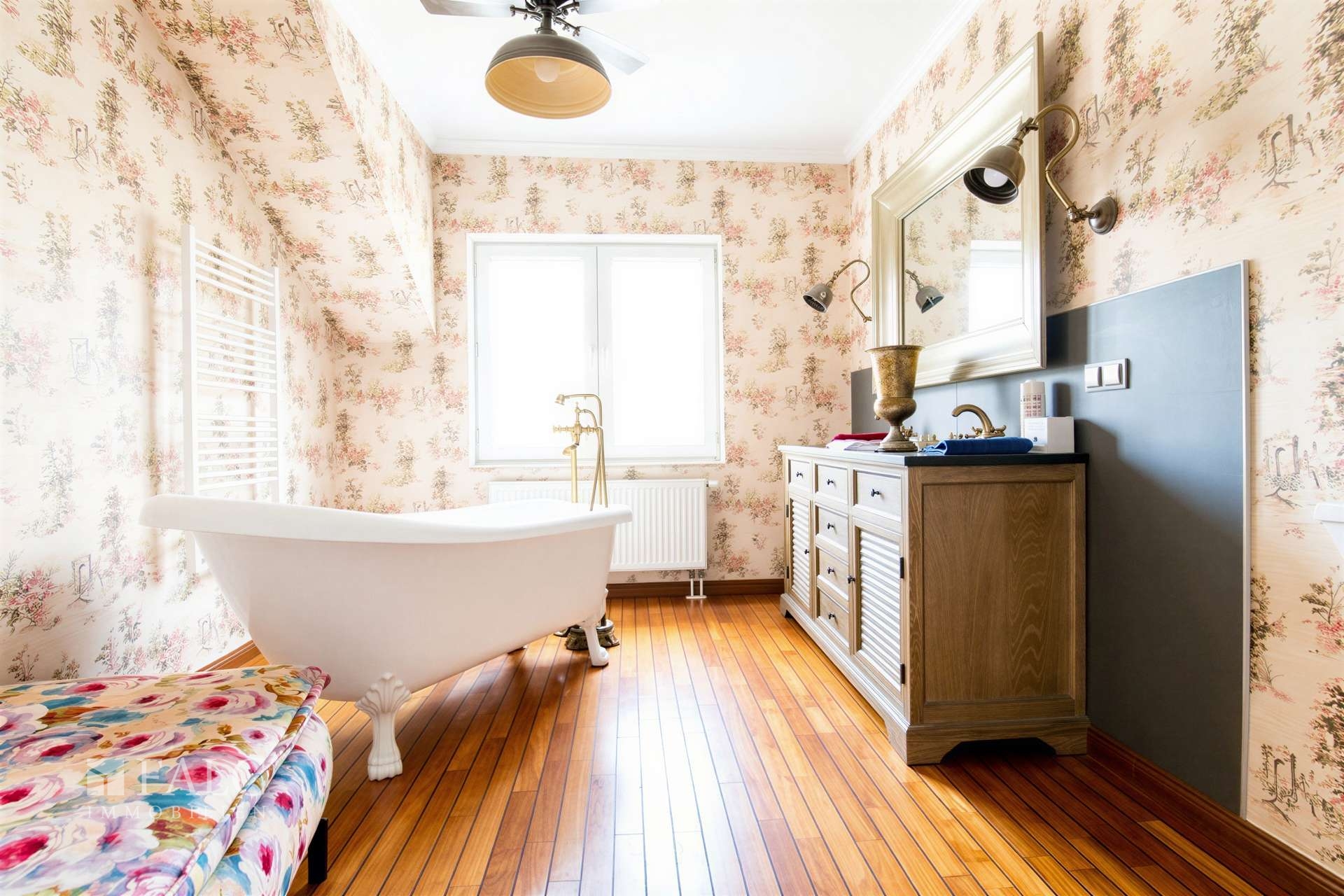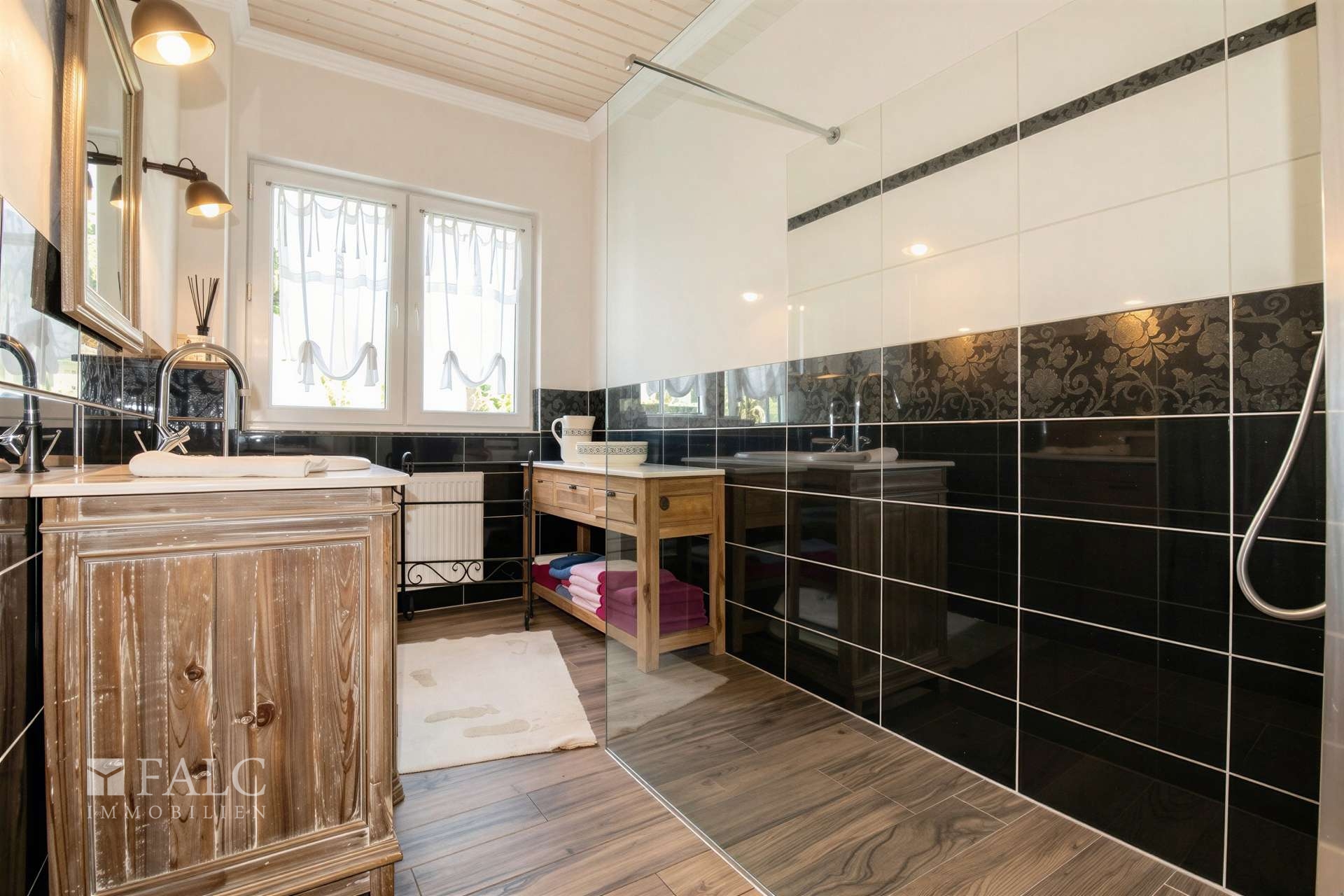 Im Erdgeschoss liegen Wohnraum und Wohnzimmer als zwei separate Bereiche, die sich je nach Bedarf als Familienbereich und ruhiger Rückzugsraum nutzen lassen. Zwei Kamine sorgen hier für eine angenehme Atmosphäre an kühleren Tagen. Das Esszimmer ist großzügig geschnitten und eignet sich für einen großen Tisch. Direkt anschließend befindet sich die Küche. Von hier führt der Zugang auf die Terrasse und weiter in den Hof, was den Alltag im Sommer besonders unkompliziert macht, ob Frühstück draußen oder kurze Wege in den Garten. Ein Büro ergänzt das Erdgeschoss sinnvoll, ebenso ein wunderschönes Badezimmer mit großer Dusche.