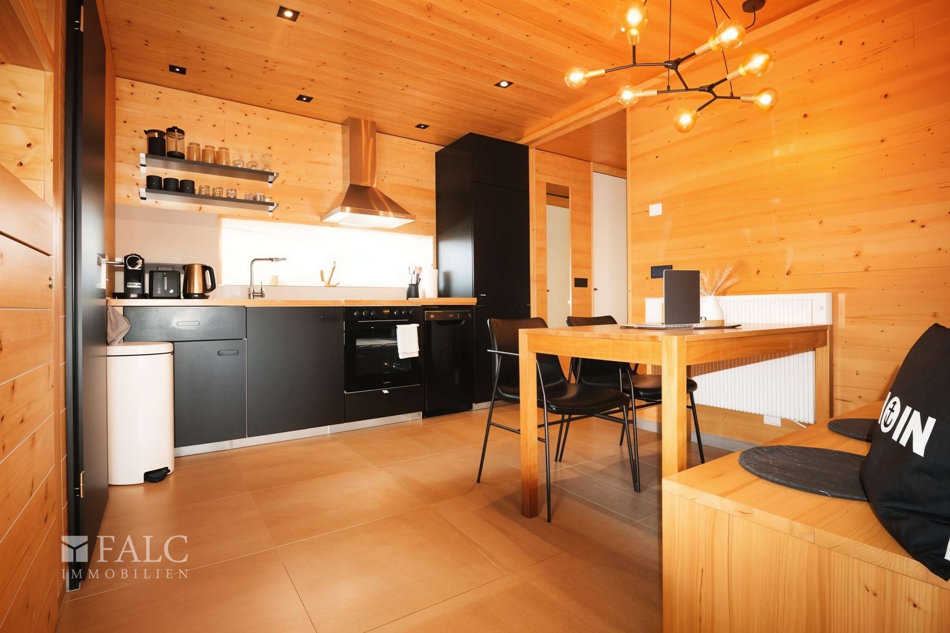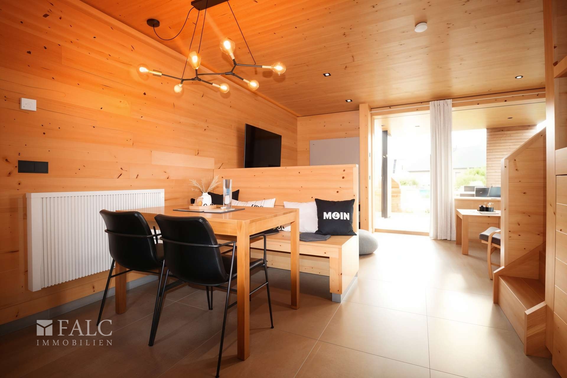 Der Wohnbereich bietet direkten Zugang zur Terrasse, die sich perfekt für gemütliche Abende im Freien eignet. Die Küchen sind modern ausgestattet und bieten alles, was Sie für die Zubereitung köstlicher Mahlzeiten benötigen. Der Essbereich ist harmonisch in den Raum integriert und bietet ausreichend Platz für gemeinsame Mahlzeiten.