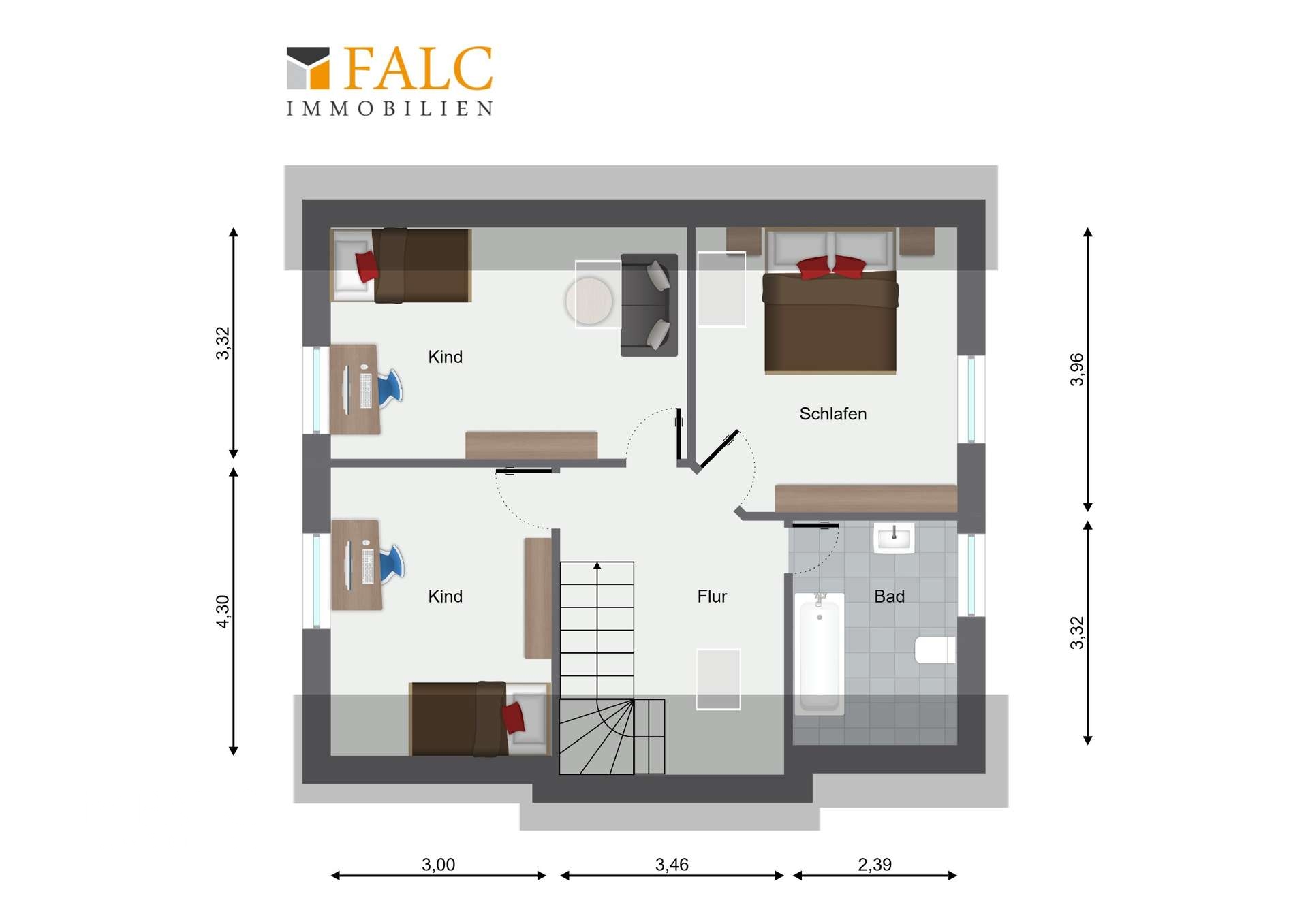 Im Obergeschoss erwarten Sie drei gut geschnittene Schlafzimmer, die sich ideal als Rückzugsorte für die ganze Familie eignen. Ein großes Badezimmer mit Badewanne und WC rundet das Raumangebot auf dieser Etage ab.