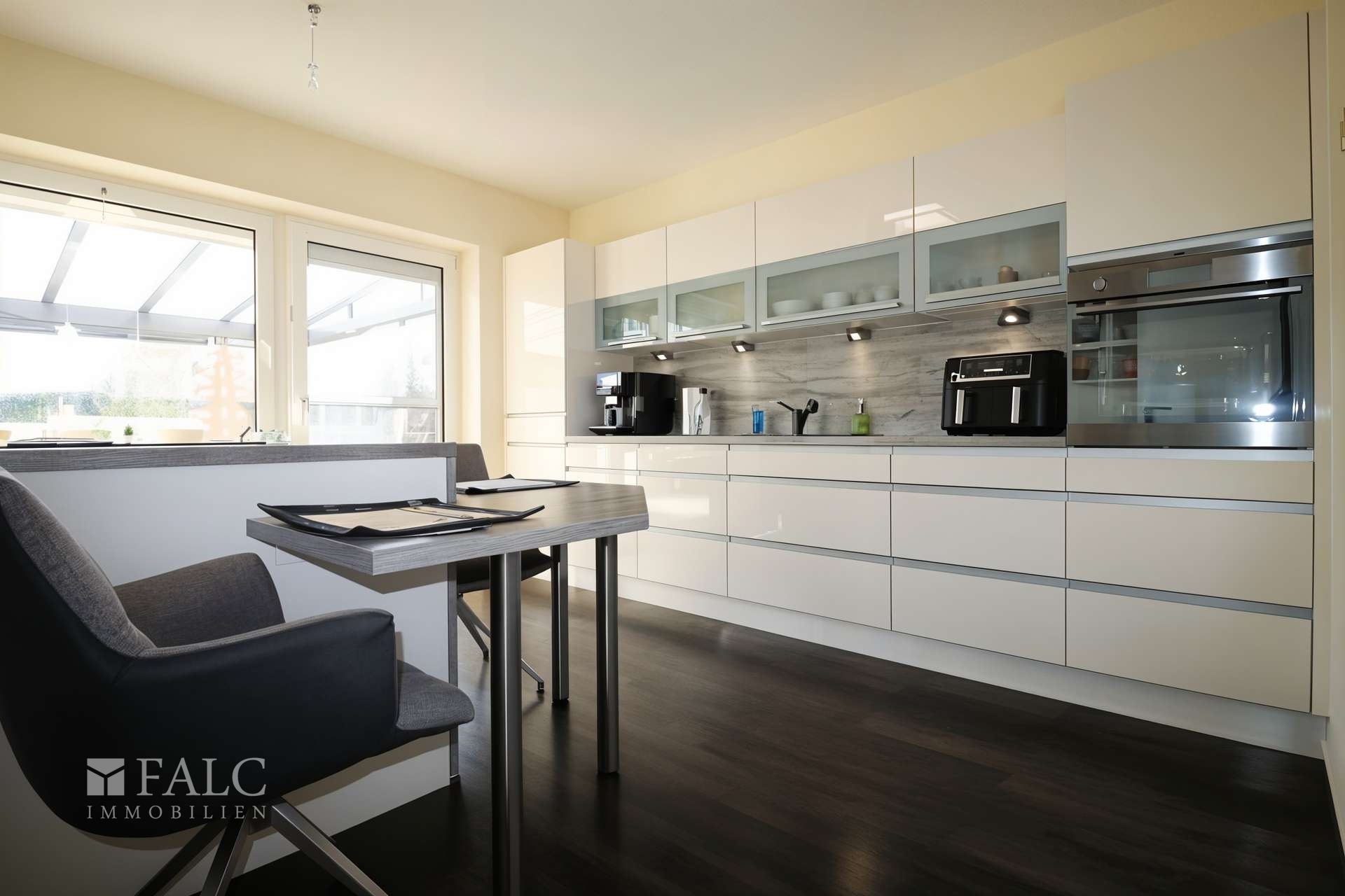 Das Herzstück des Erdgeschosses ist das geräumige Wohnzimmer, das durch seine offene Gestaltung mit dem Essbereich verbunden ist. Große Fenster sorgen für viel Tageslicht und schaffen eine angenehme Atmosphäre. Von hier aus gelangen Sie in die angrenzende Küche, die ebenfalls mit einer Fußbodenheizung ausgestattet ist und mit modernen Geräten aufwartet. Sie bietet direkten Zugang zu einem beeindruckenden Wintergarten, der ein Highlight des Hauses darstellt und zu entspannten Stunden mit Blick in den Garten einlädt.