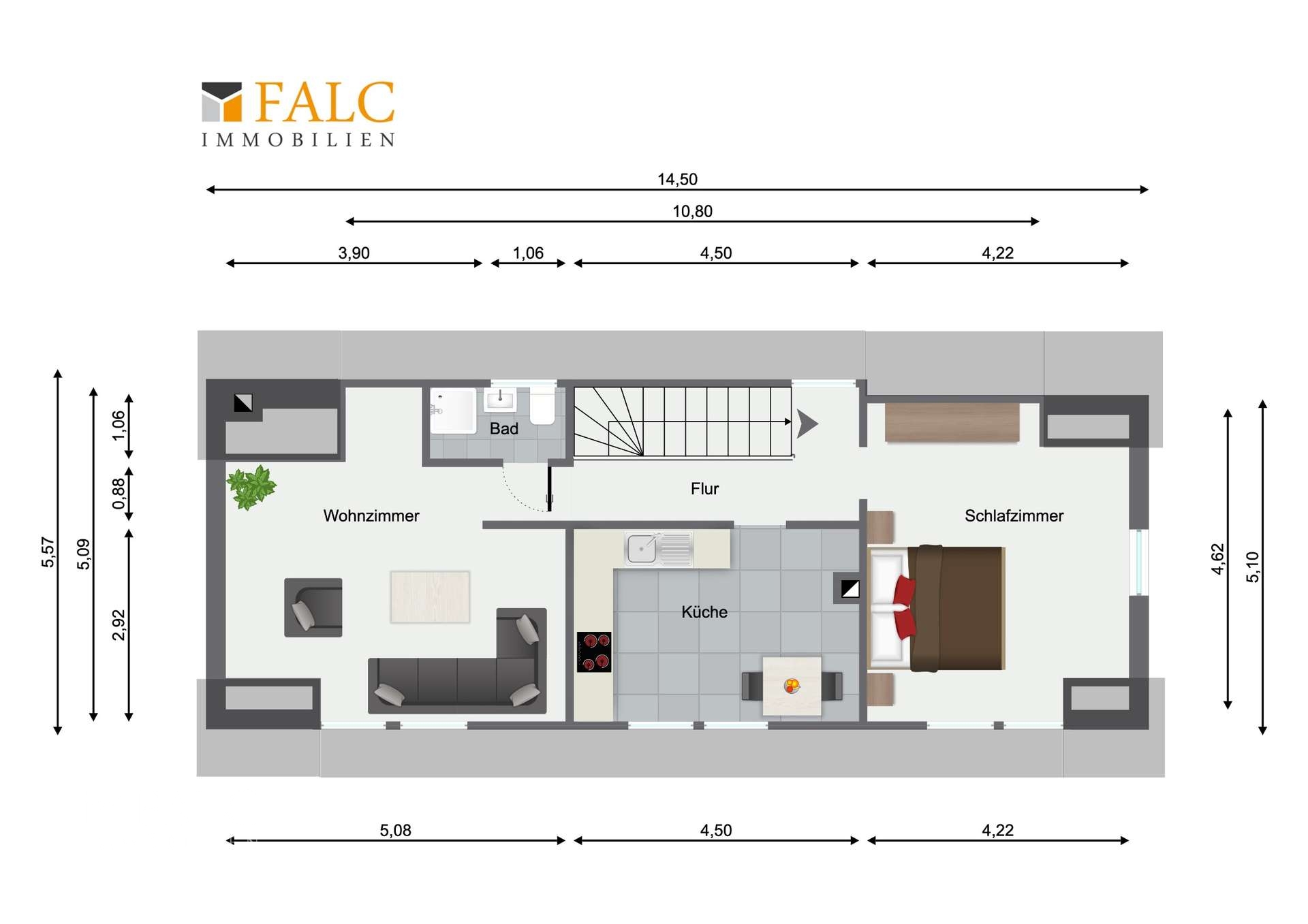 Der Rundgang beginnt am Hauseingang. Hinter der Tür empfängt ein Flur mit Platz für Garderobe und Schuhschrank. Von hier aus erschließen sich die Räume des Erdgeschosses: ein Esszimmer mit offener Küche sowie ein Wohnzimmer befinden sich auf der rechten Seite des Flurs. Ergänzt wird diese Ebene durch ein Schlafzimmer und ein Badezimmer, das als Duschbad ausgeführt ist auf der linken Seite des Flurs. Diese Etage ist aktuell vermietet für 350,00 € Kaltmiete im Monat.