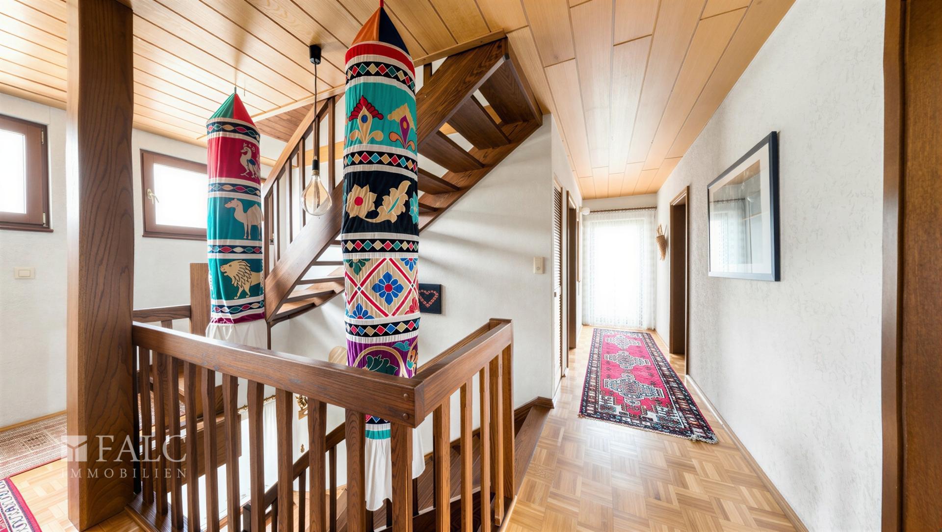 Im Erdgeschoss gliedert sich die Ebene in einen zentralen Flur, von dem aus die Räume klar erreichbar sind. Hier liegen das Wohnzimmer und das Esszimmer sowie die Küche als eigener Bereich. Ergänzend stehen ein Büro mit Bibliothek und ein Gäste WC zur Verfügung. Vom Flur aus besteht ein direkter Zugang zur Garage.