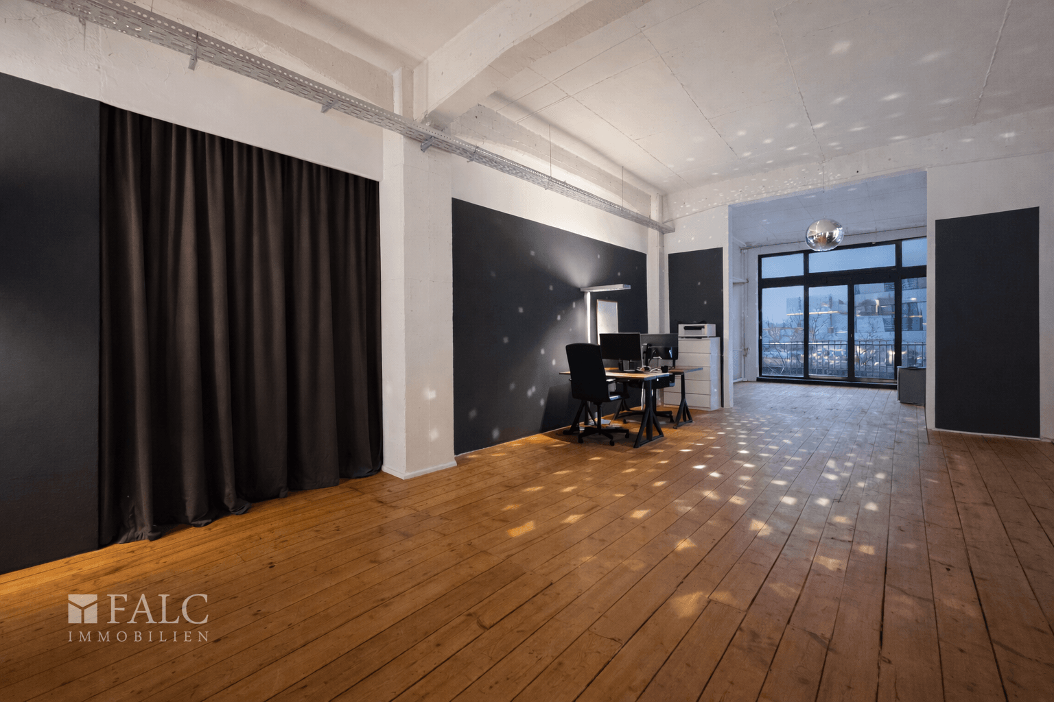Hohe Decken, sichtbare Betonträger, warme Echtholzdielen und großzügige Fensterflächen schaffen eine Atmosphäre, die inspiriert. Das offene Raumkonzept bietet Flexibilität für kreative Teams, ambitionierte Unternehmer oder innovative Agenturen, die nicht einfach nur arbeiten – sondern gestalten wollen.