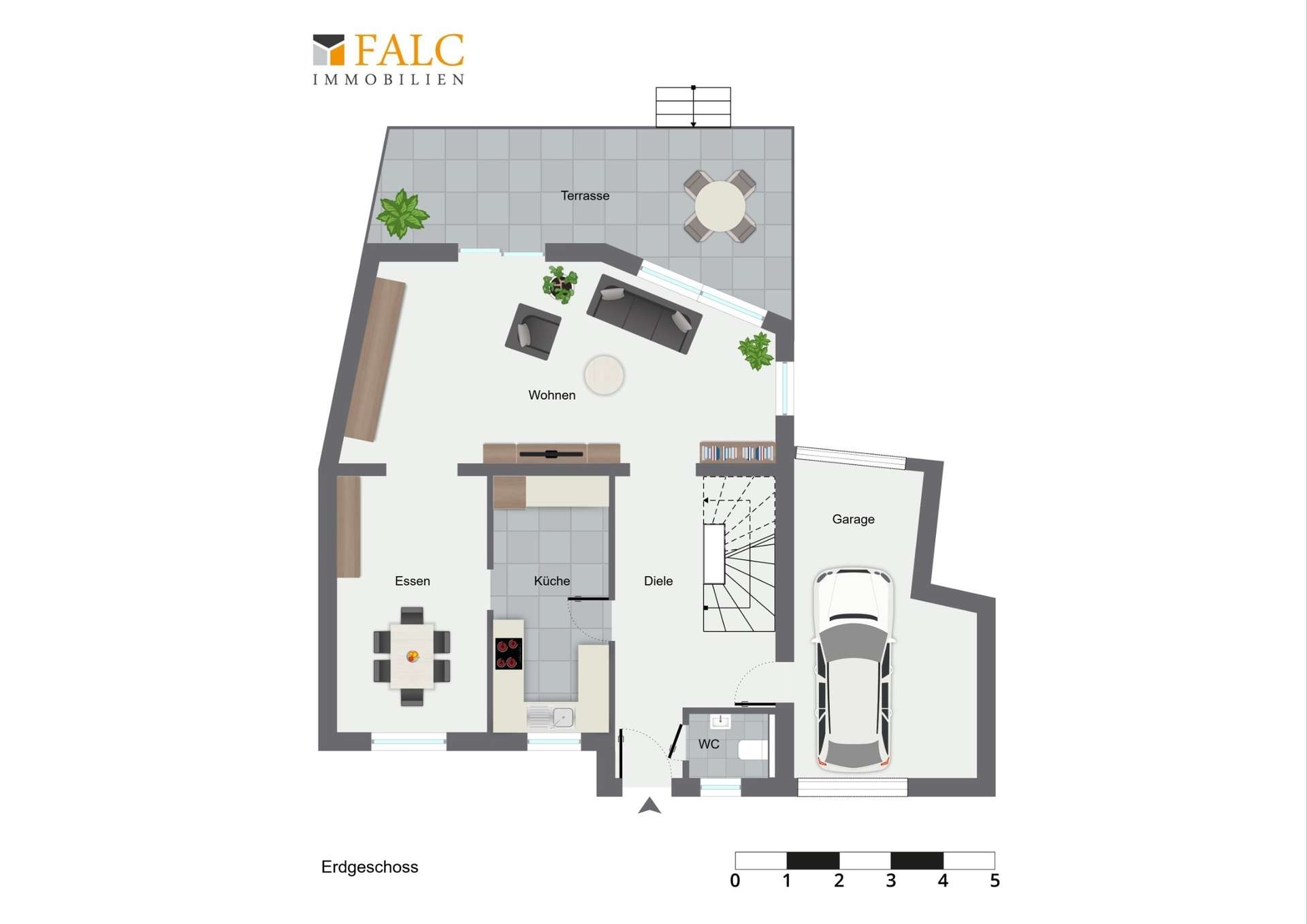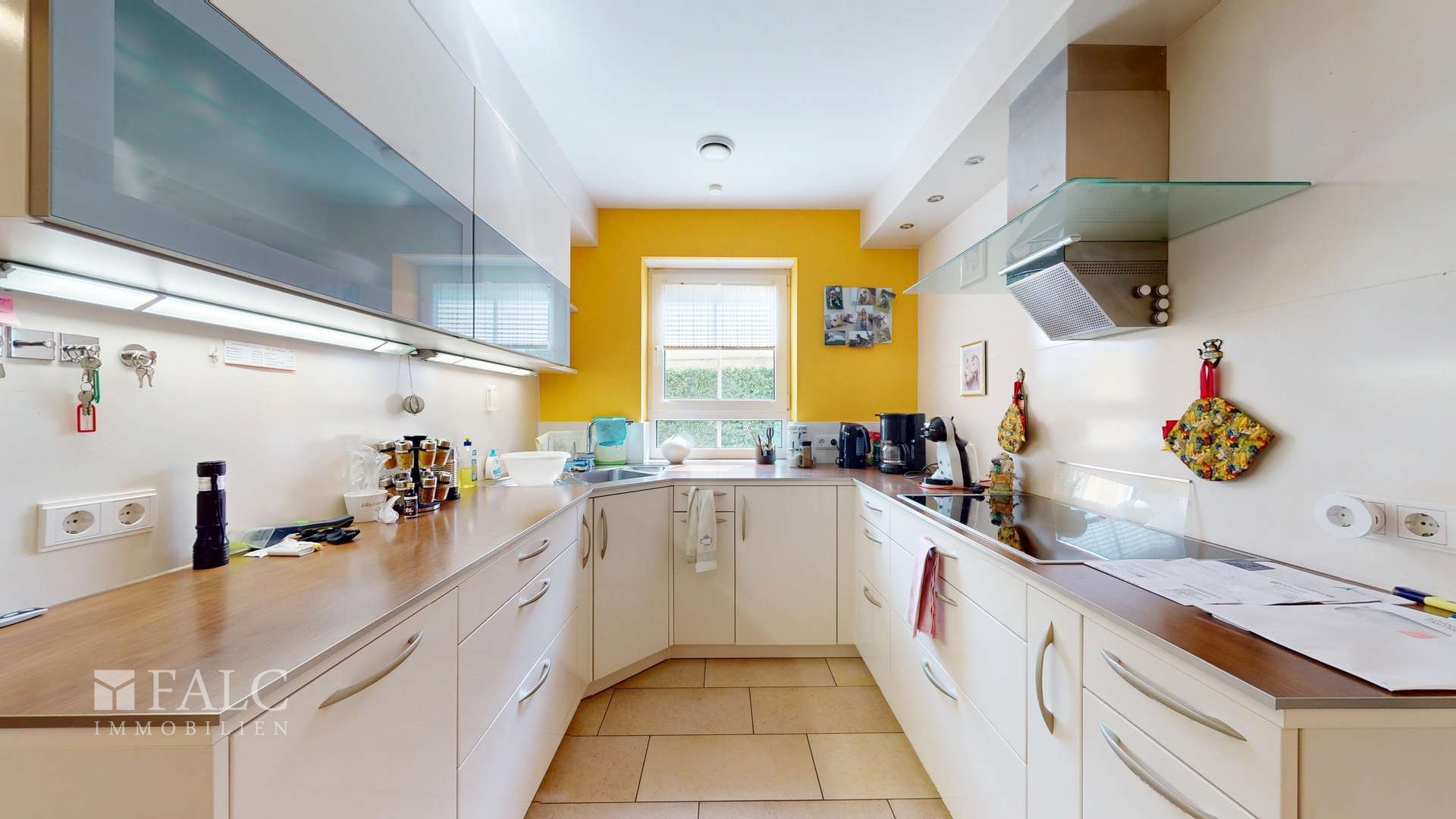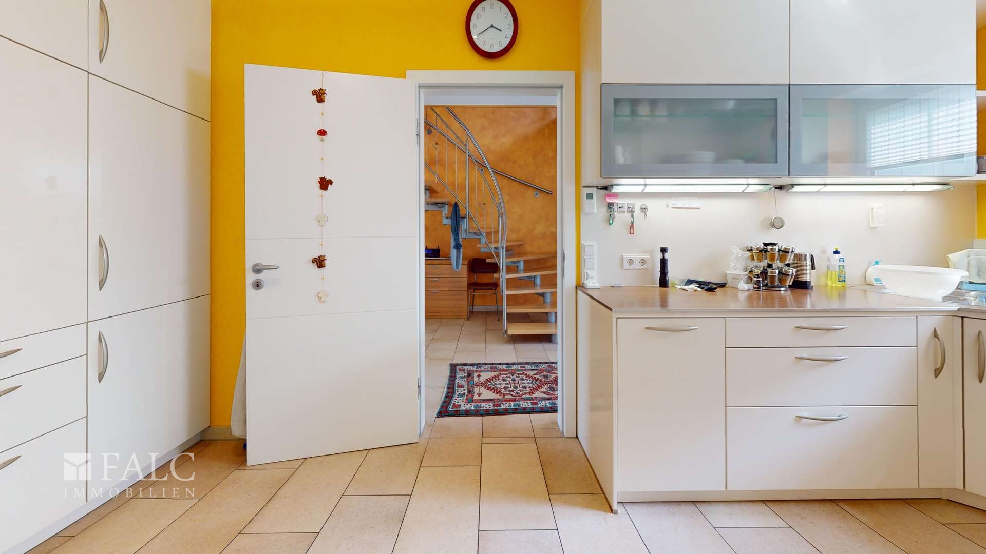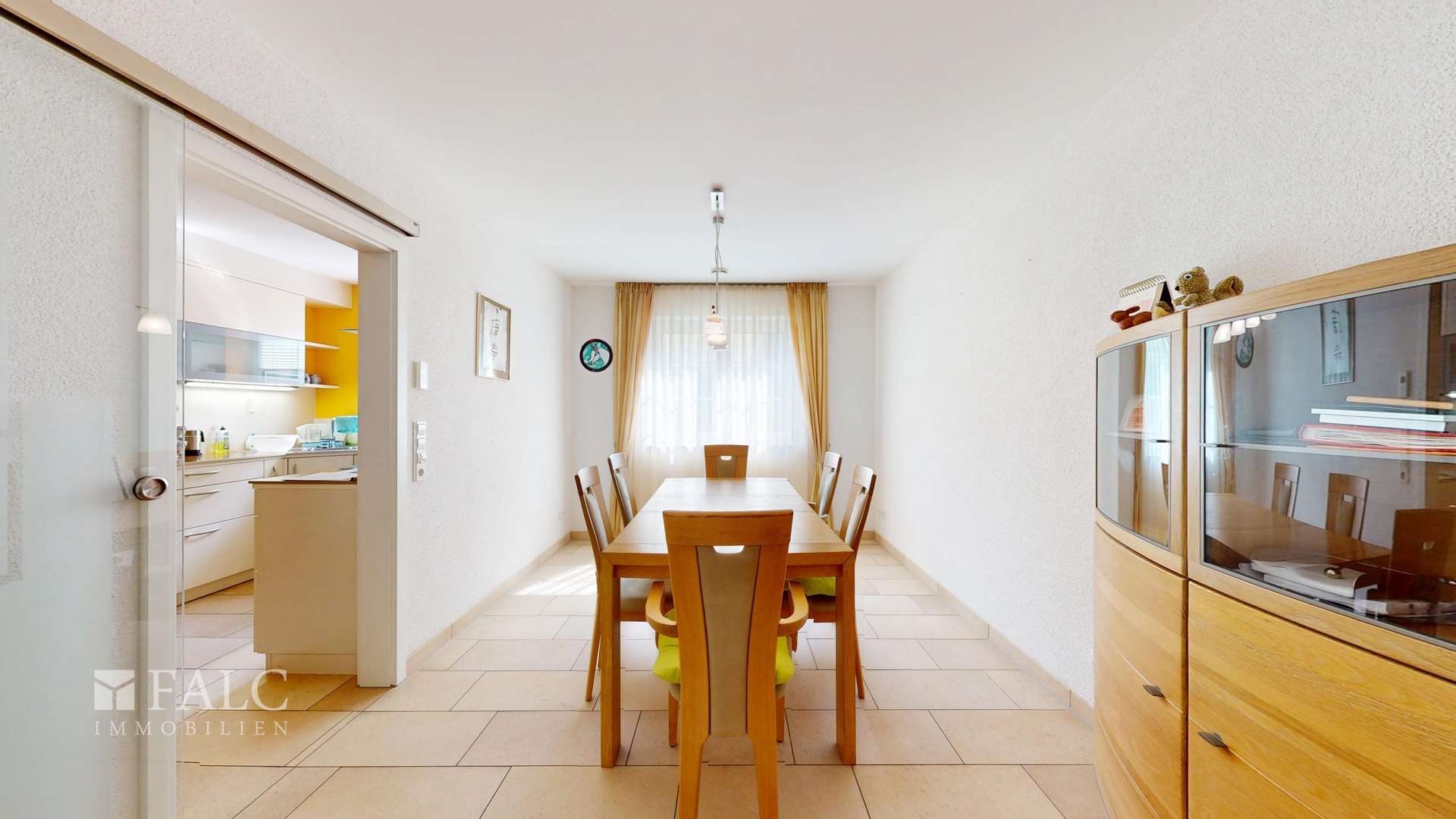 Die angrenzende Küche ist modern ausgestattet und bietet ausreichend Platz für kulinarische Abenteuer. Der Essbereich ist ideal für gesellige Abende mit Familie und Freunden. Ein praktisches Gäste-WC rundet das Erdgeschoss ab.