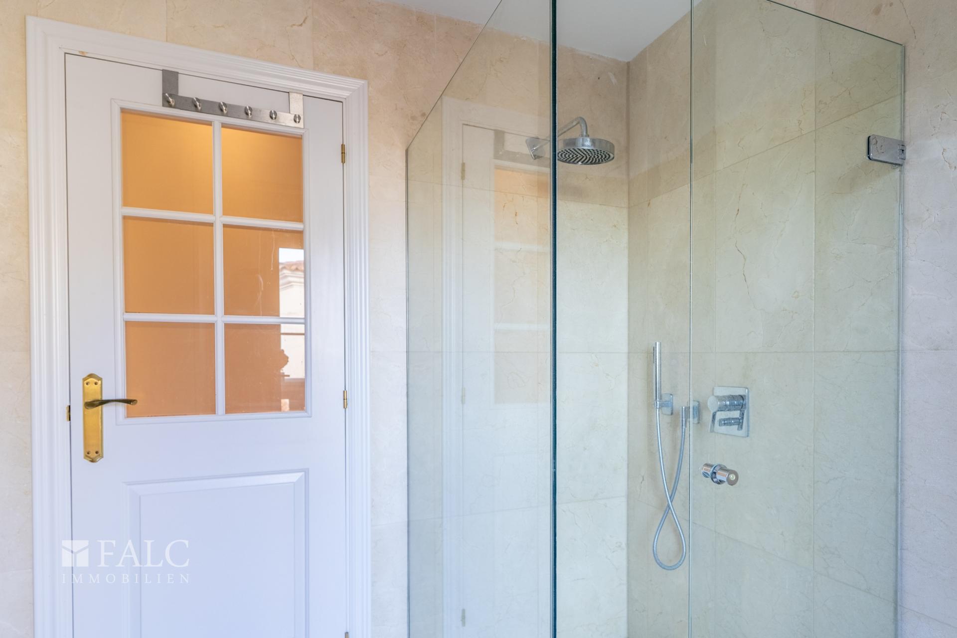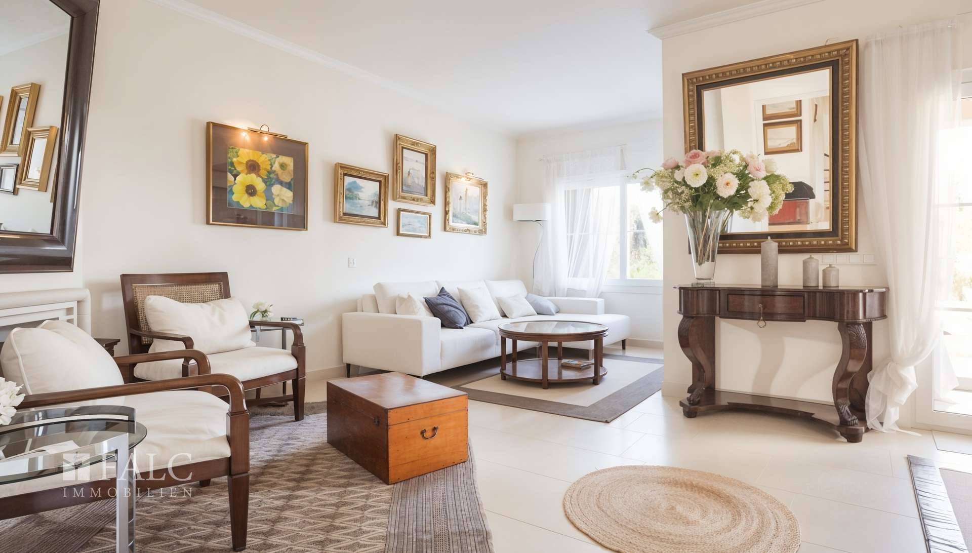 Im Obergeschoss liegen drei Schlafzimmer und drei Badezimmer. Von der oberen Terrasse aus genießen Sie einen leichten Meerblick – ideal für entspannte Momente im mediterranen Klima. Das Haus ist nicht modern, jedoch gepflegt und mit allen wichtigen Annehmlichkeiten ausgestattet.