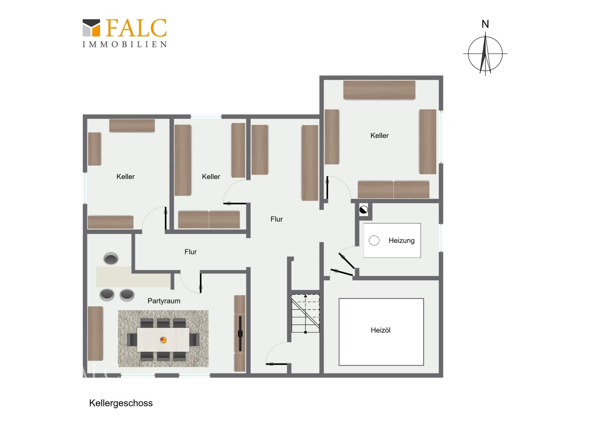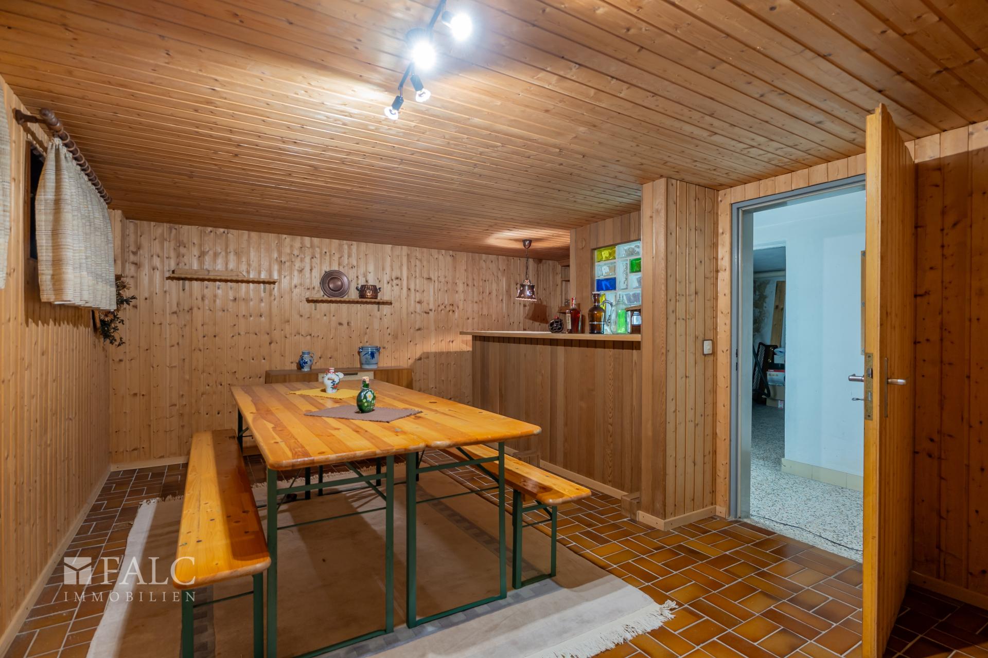Das Haus ist vollständig unterkellert und bietet damit viel Stauraum und zusätzliche Nutzungsmöglichkeiten. Neben drei separaten Kellerräumen gibt es einen Heizungsraum, einen Raum für den Heizöltank sowie einen großzügigen Partyraum mit eigener Bar, der sich hervorragend für Feiern eignet. In einem der Kellerräume ist Feuchtigkeit sichtbar, vermutlich verursacht durch eine Regenrinne, die überprüft werden sollte.