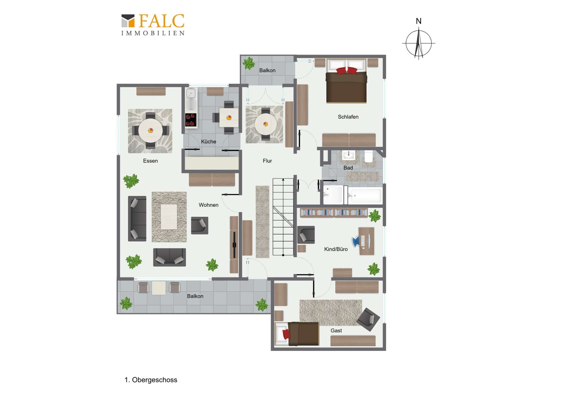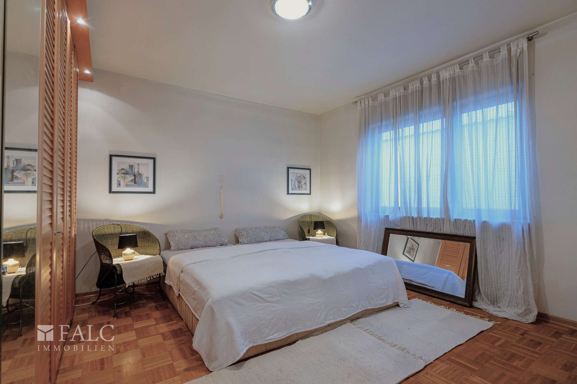 Im Obergeschoss befindet sich die zweite Wohneinheit, die ebenfalls großzügig gestaltet ist und vier Zimmer, Küche sowie ein Badezimmer mit Wanne und Dusche umfasst. Das helle und offene Wohn- und Esszimmer misst ebenfalls rund 38 Quadratmeter und bietet, wie im Erdgeschoss, einen direkten Zugang zur Küche. Ein Schlafzimmer verfügt über einen eigenen kleinen Balkon, während ein weiteres Zimmer als Büro oder zweites Schlafzimmer genutzt werden kann. Von dort aus führt ein Durchgang in ein zusätzliches Zimmer, das sich als Gästezimmer oder begehbarer Kleiderschrank anbietet. Im Obergeschoss gibt es – abgesehen vom "Ankleidezimmer" – keine Dachschrägen, was die Räume angenehm offen wirken lässt. Der Flur ist mit den gleichen, hellen und zeitlosen Steinfliesen ausgestattet wie im Erdgeschoss, während das Wohn- und Esszimmer gefliest ist und das Schlafzimmer über einen Parkettboden verfügt. Vom Flur aus gelangt man zudem auf beide Balkone, die dem Obergeschoss zusätzliche Aufenthaltsqualität verleihen.