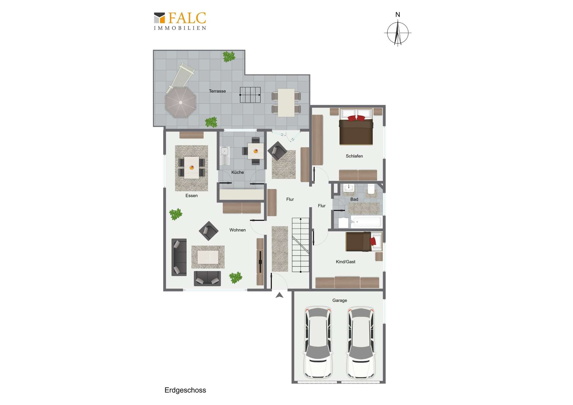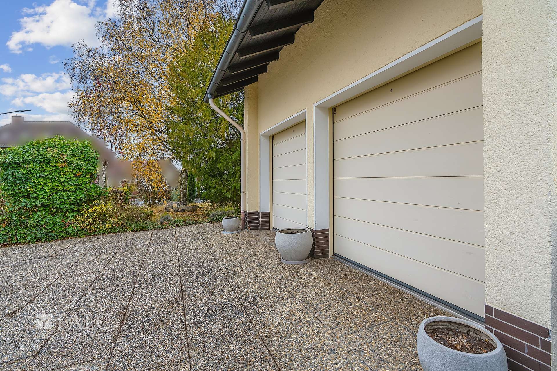 Der Außenbereich des Hauses umfasst eine große Doppelgarage mit elektrischen Sektionaltoren, einen großzügigen Vorgarten sowie einen pflegeleichten Garten hinter dem Haus. Das gesamte Grundstück ist schön eingewachsen und bietet damit ein hohes Maß an Privatsphäre.