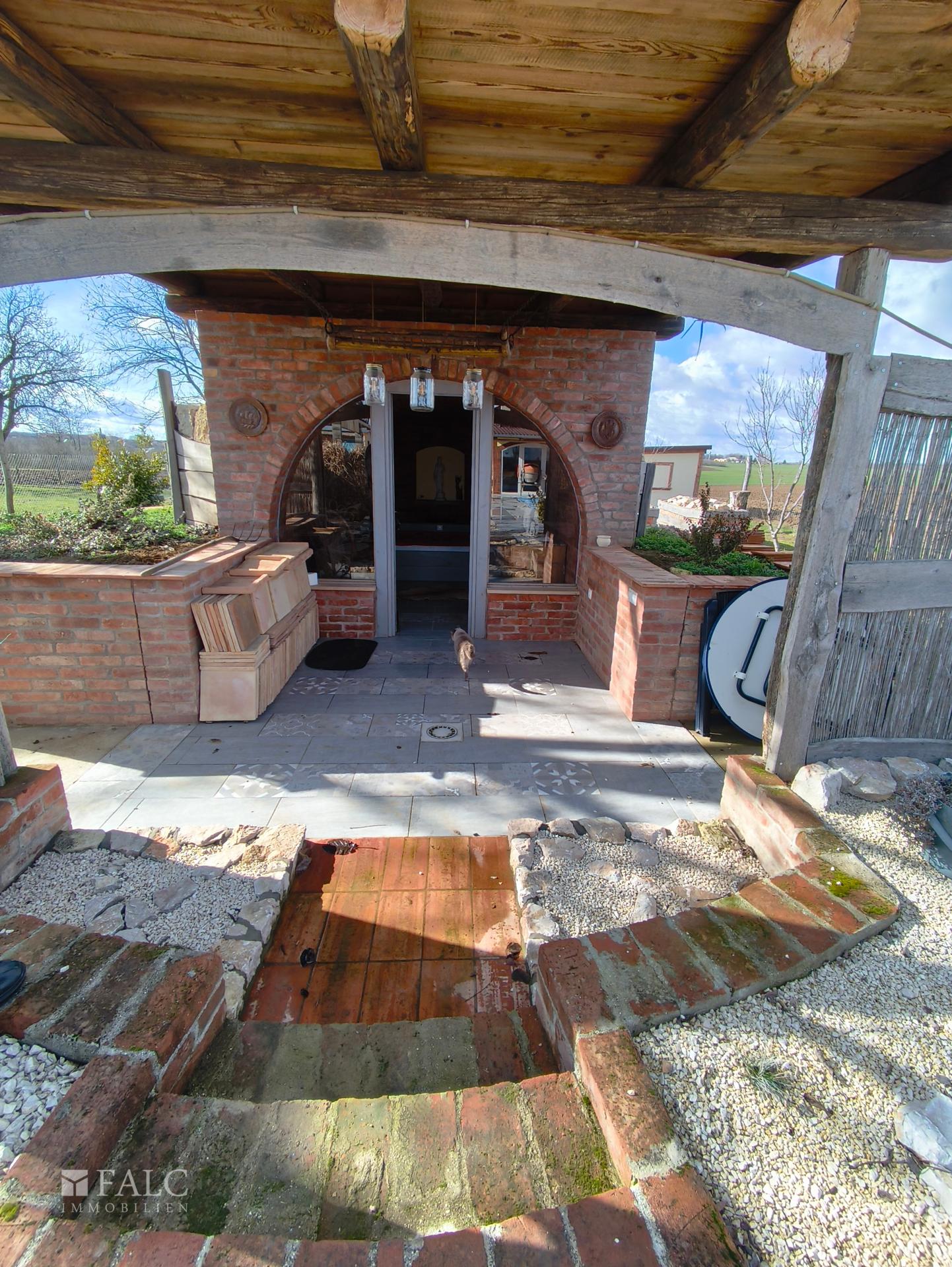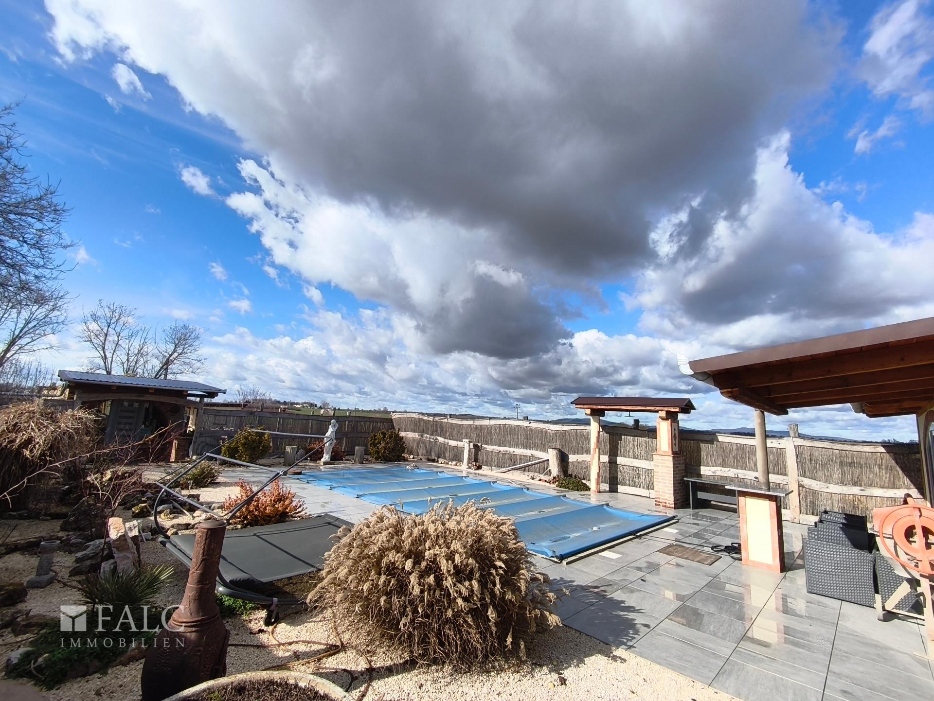 Im Außenbereich befindet sich ein Pool (8 x 4 m, 1,50 m tief), ein Relaxraum, Hochbeete, Wasserbehältergebäude sowie mehrere Nebengebäude. Der Garten bietet viel Privatsphäre und Raum zur individuellen Gestaltung.