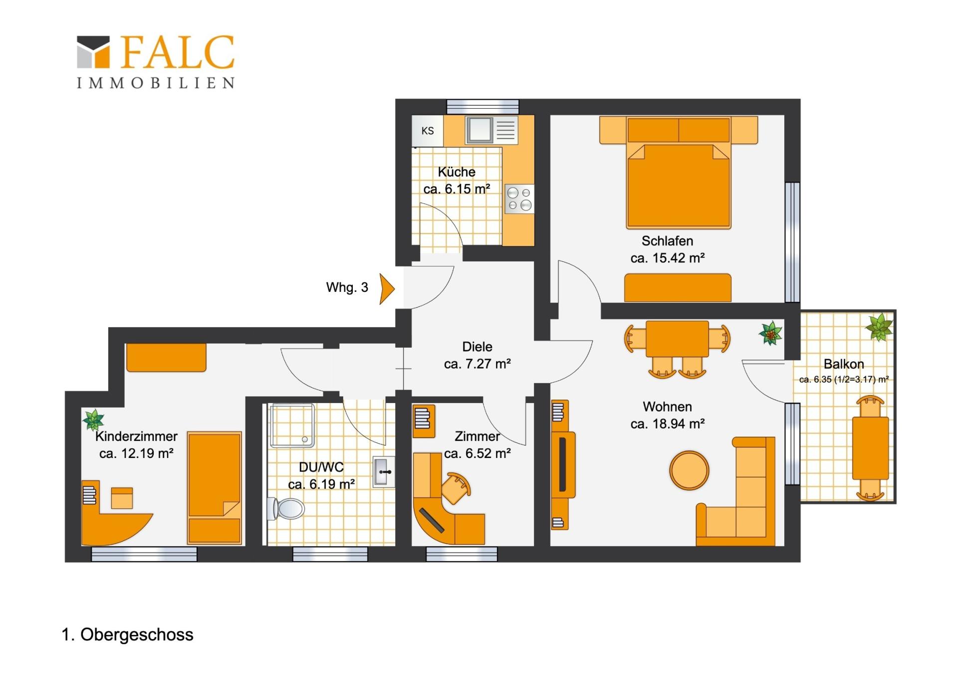 + Balkon mit ca. 6,3 m² Gesamtfläche