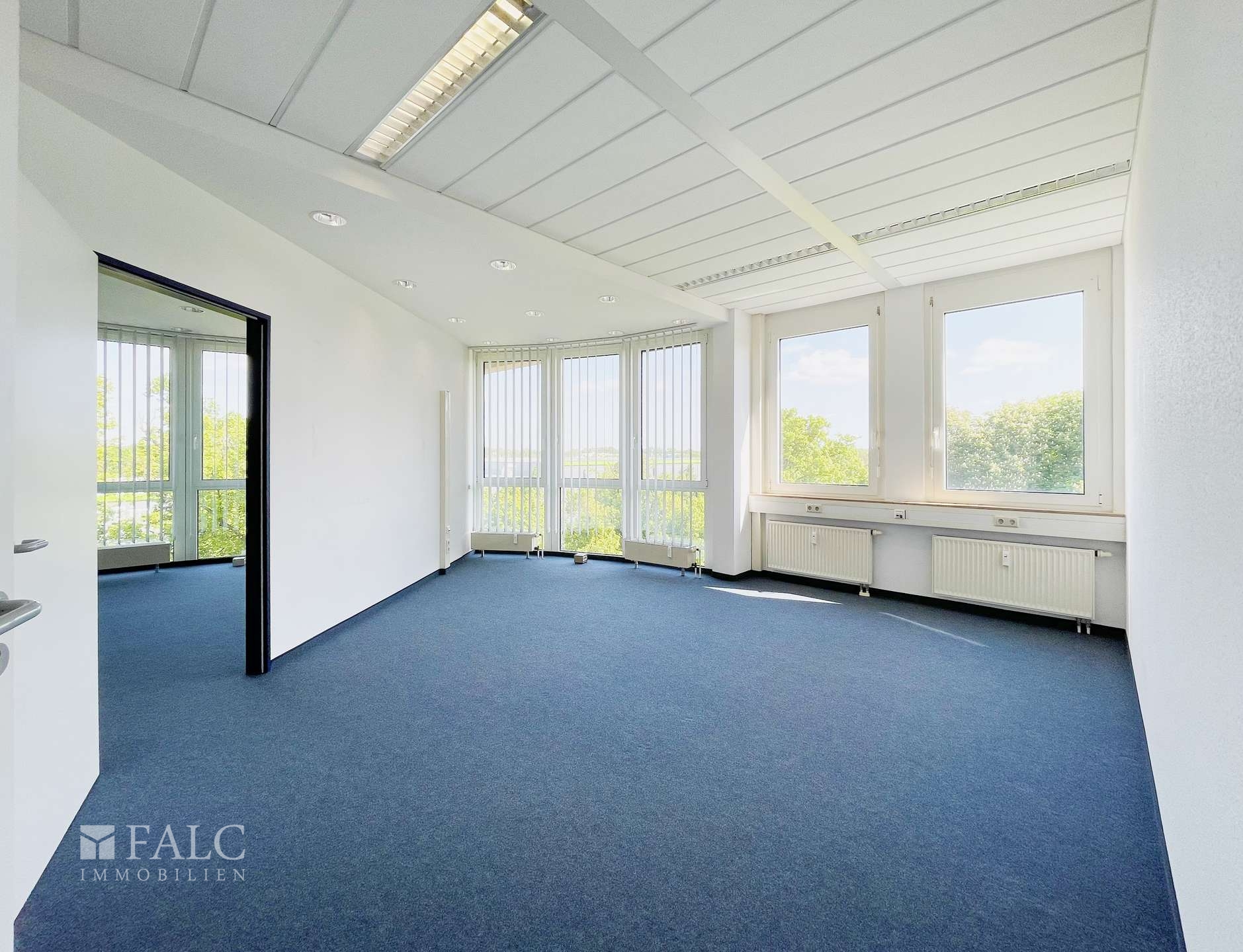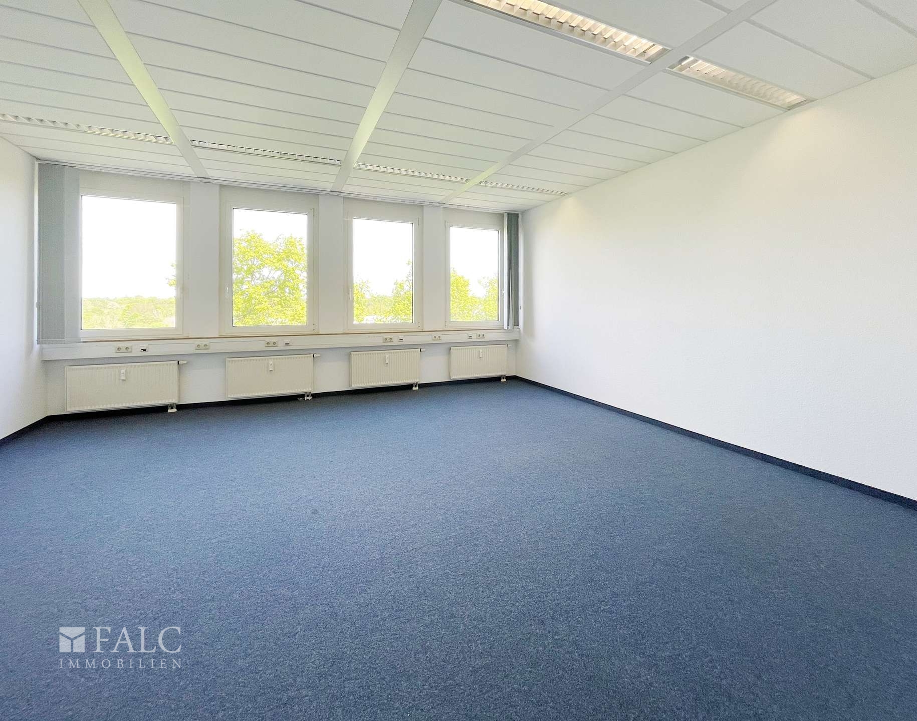 Die Beleuchtung erfolgt über moderne Bürolampen, die für eine optimale Ausleuchtung sorgen. Die Fenster sind doppelt verglast, sodass eine ruhige Arbeitsumgebung gewährleistet ist.