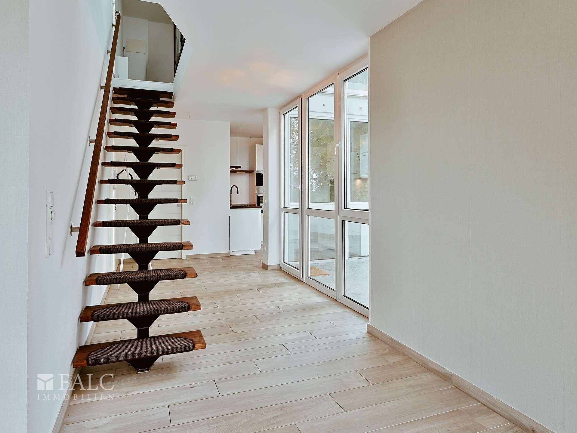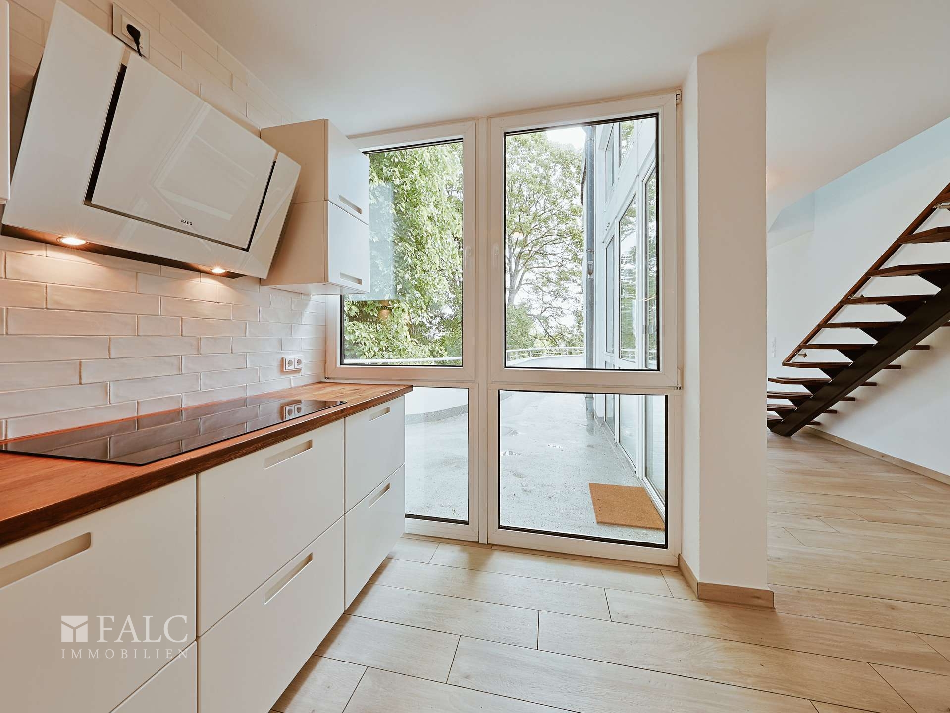Großzügige Fensterflächen sorgen in allen Bereichen für ein helles, freundliches Wohnambiente. Die moderne Einbauküche mit Blick ins Grüne fügt sich harmonisch in das offene Wohnkonzept ein und bietet ideale Voraussetzungen für kulinarische Abende in stilvollem Rahmen.