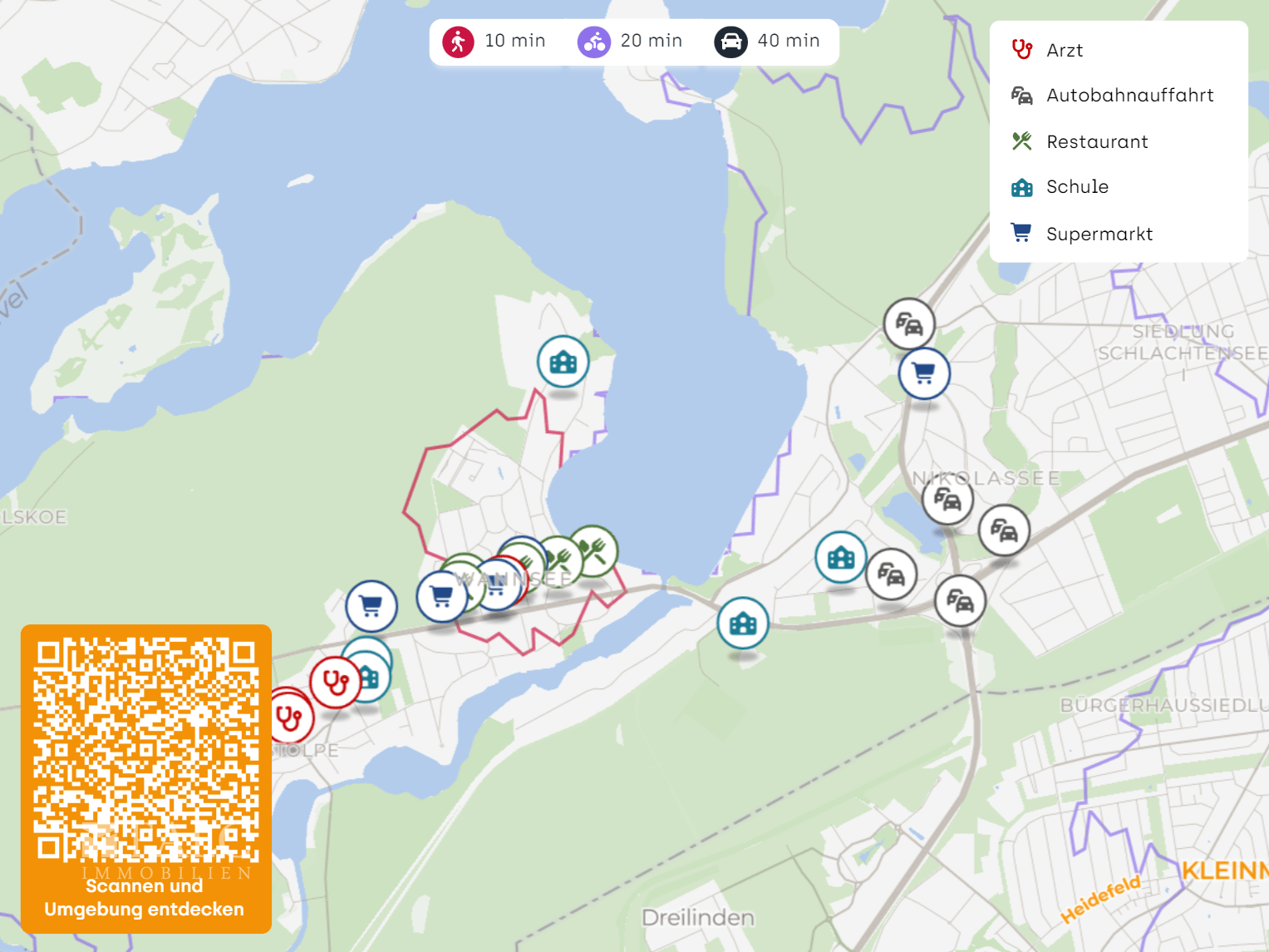 Die Umgebung ist geprägt von gepflegten Villen, altem Baumbestand und einer angenehm zurückhaltenden Nachbarschaft. Trotz der naturnahen Lage sind alle Dinge des täglichen Bedarfs bequem erreichbar: Vom Bahnhof Wannsee erreichen Sie in unter 30 Minuten das Zentrum Berlins oder in nur 6 Minuten den Potsdamer Hauptbahnhof. Werfen Sie auch einen Blick in unsere exklusive FALC Standortanalyse!