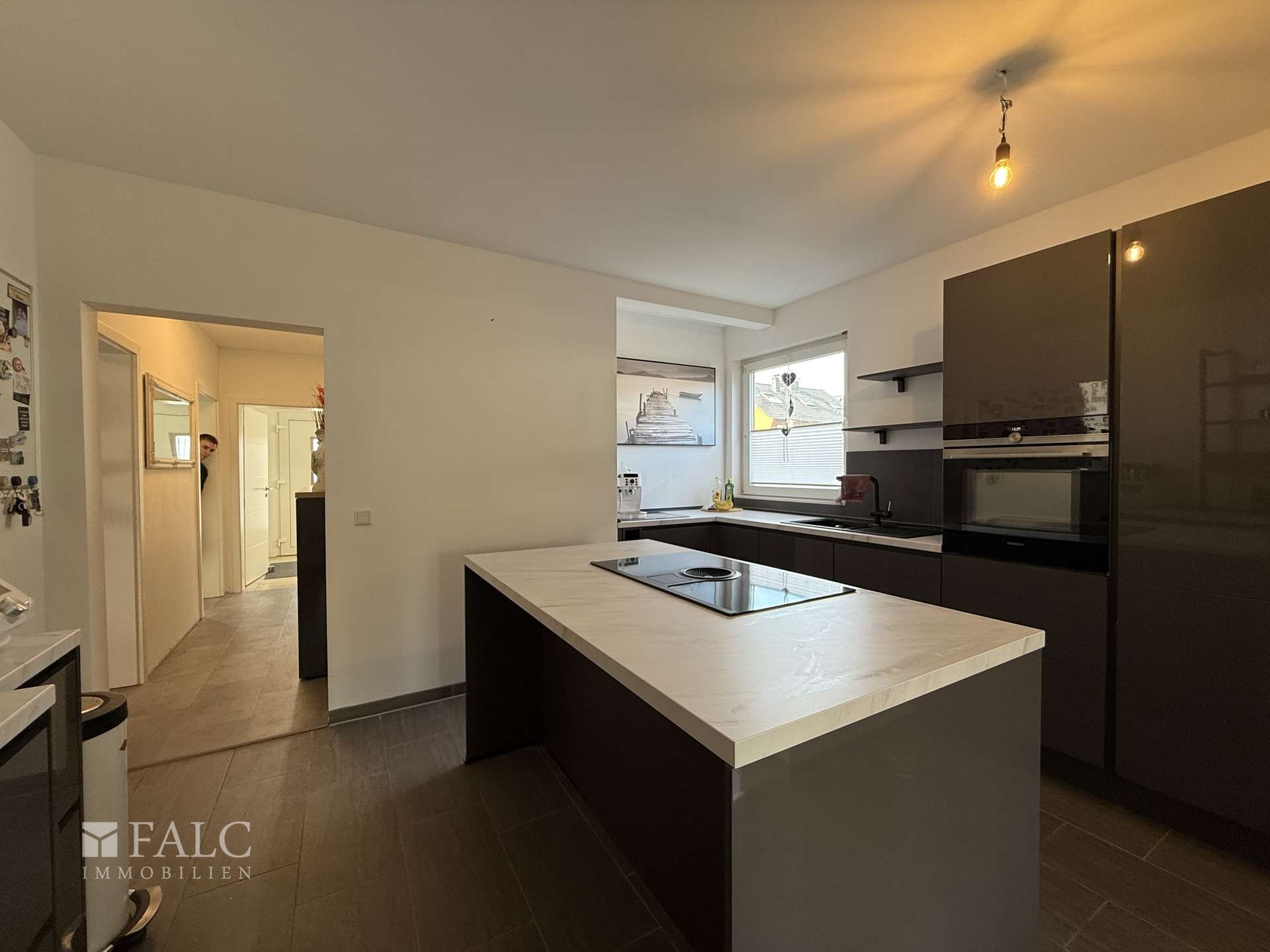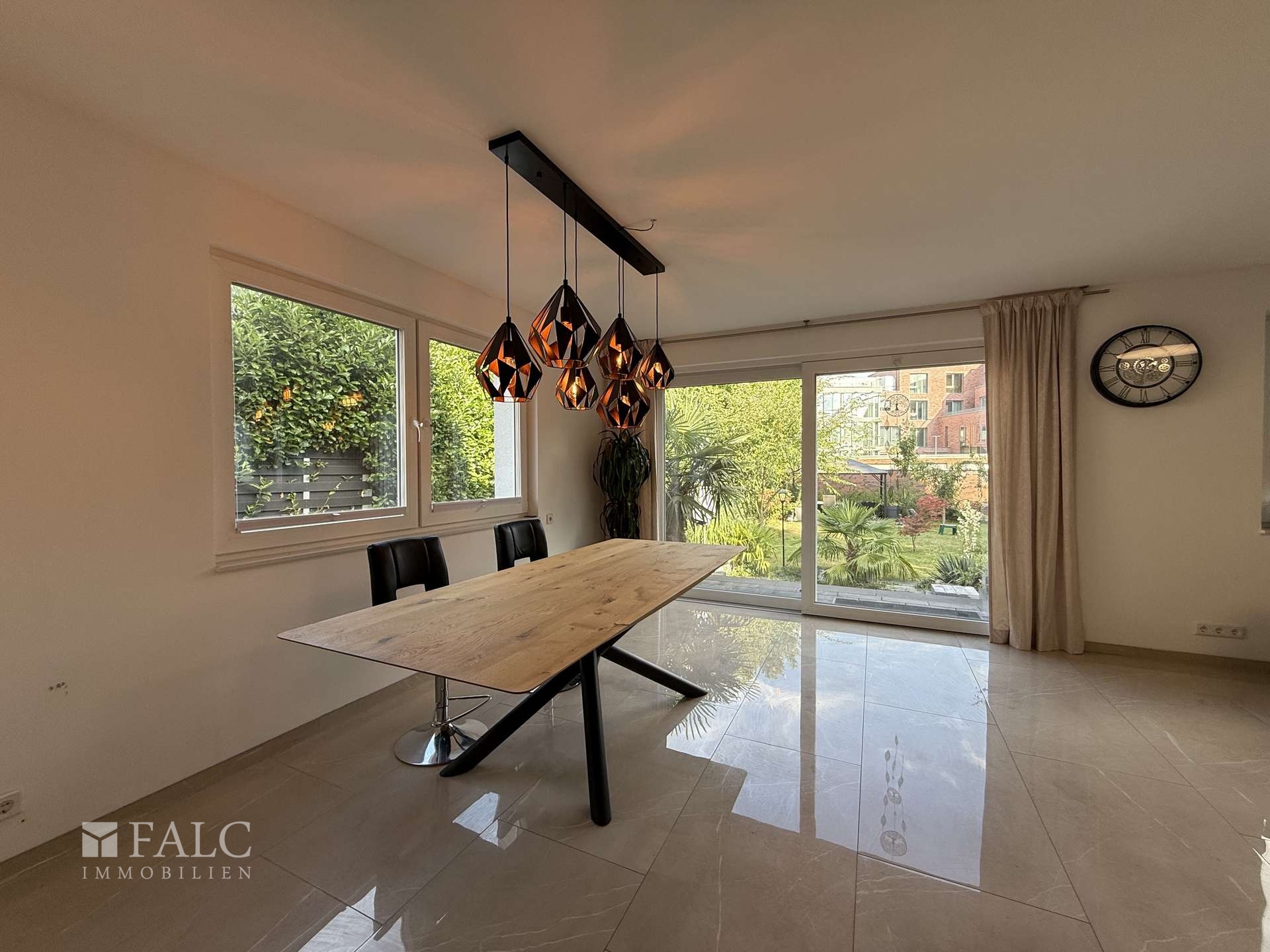Die angrenzende Küche ist modern und funktional ausgestattet – mit hochwertigen Elektrogeräten, viel Stauraum und einer klaren Linienführung, die Kochen zum Vergnügen macht. Direkt daneben liegt das offen gestaltete Esszimmer, das ideal für gesellige Abende oder gemeinsame Mahlzeiten geeignet ist.