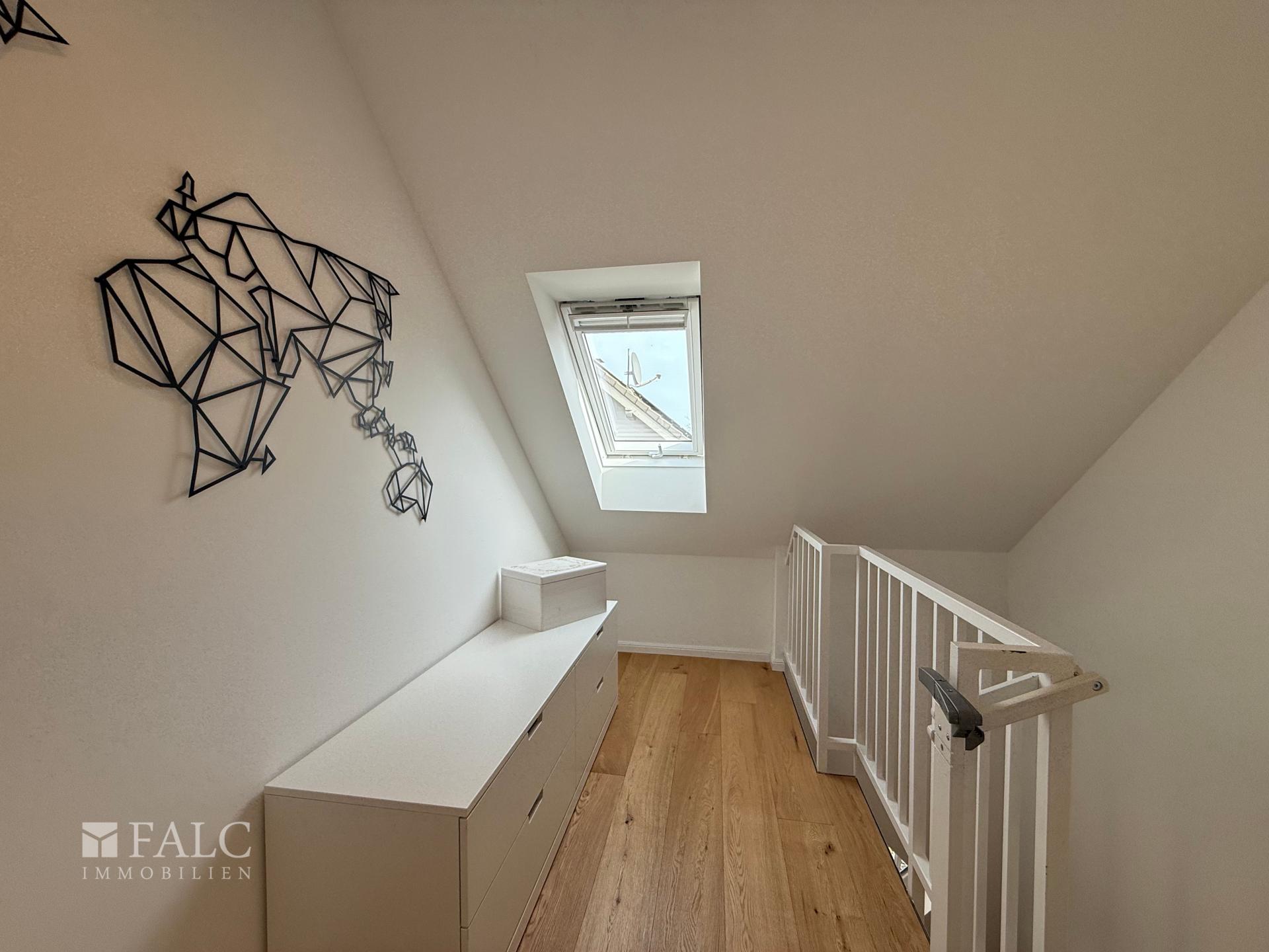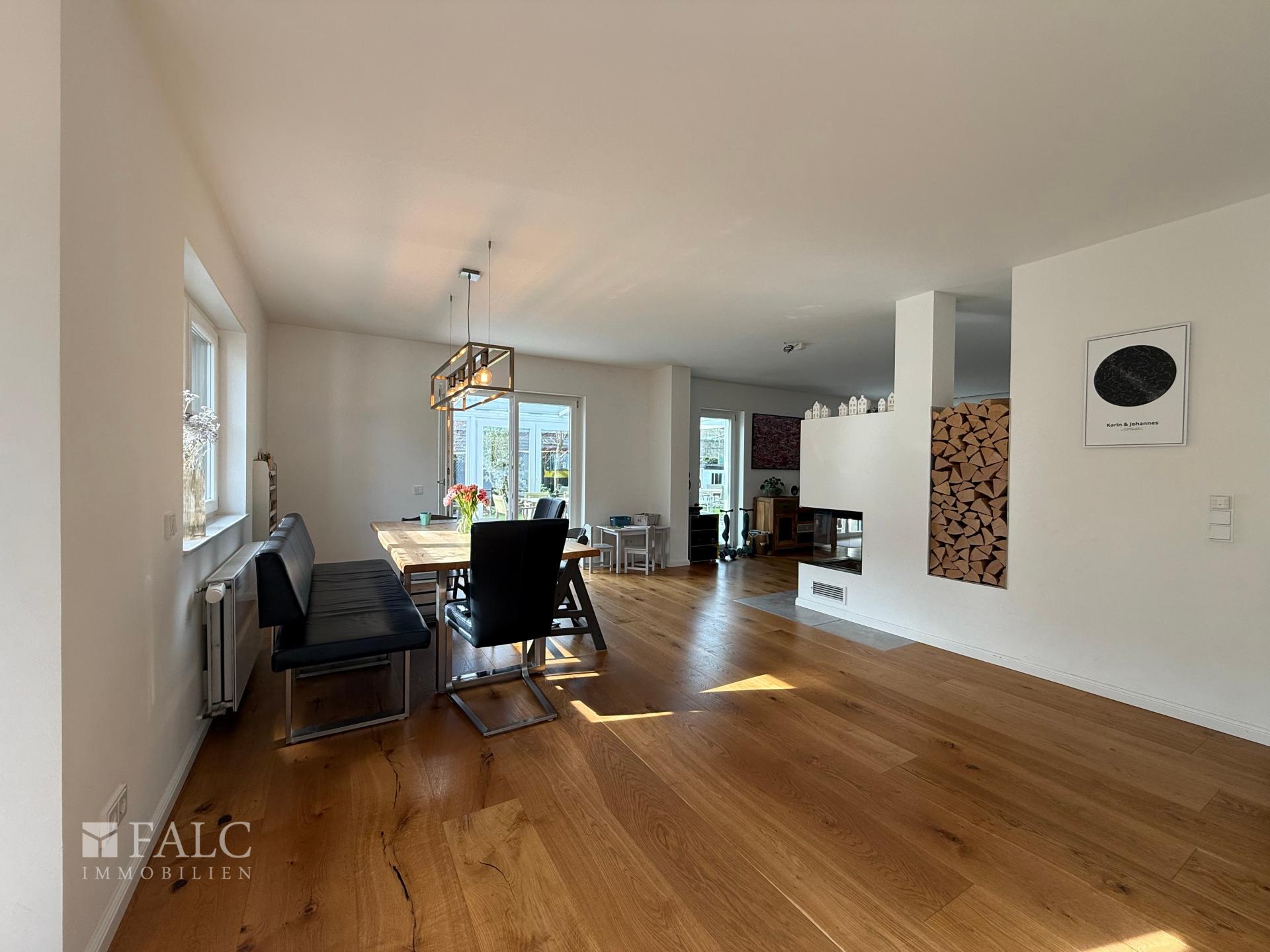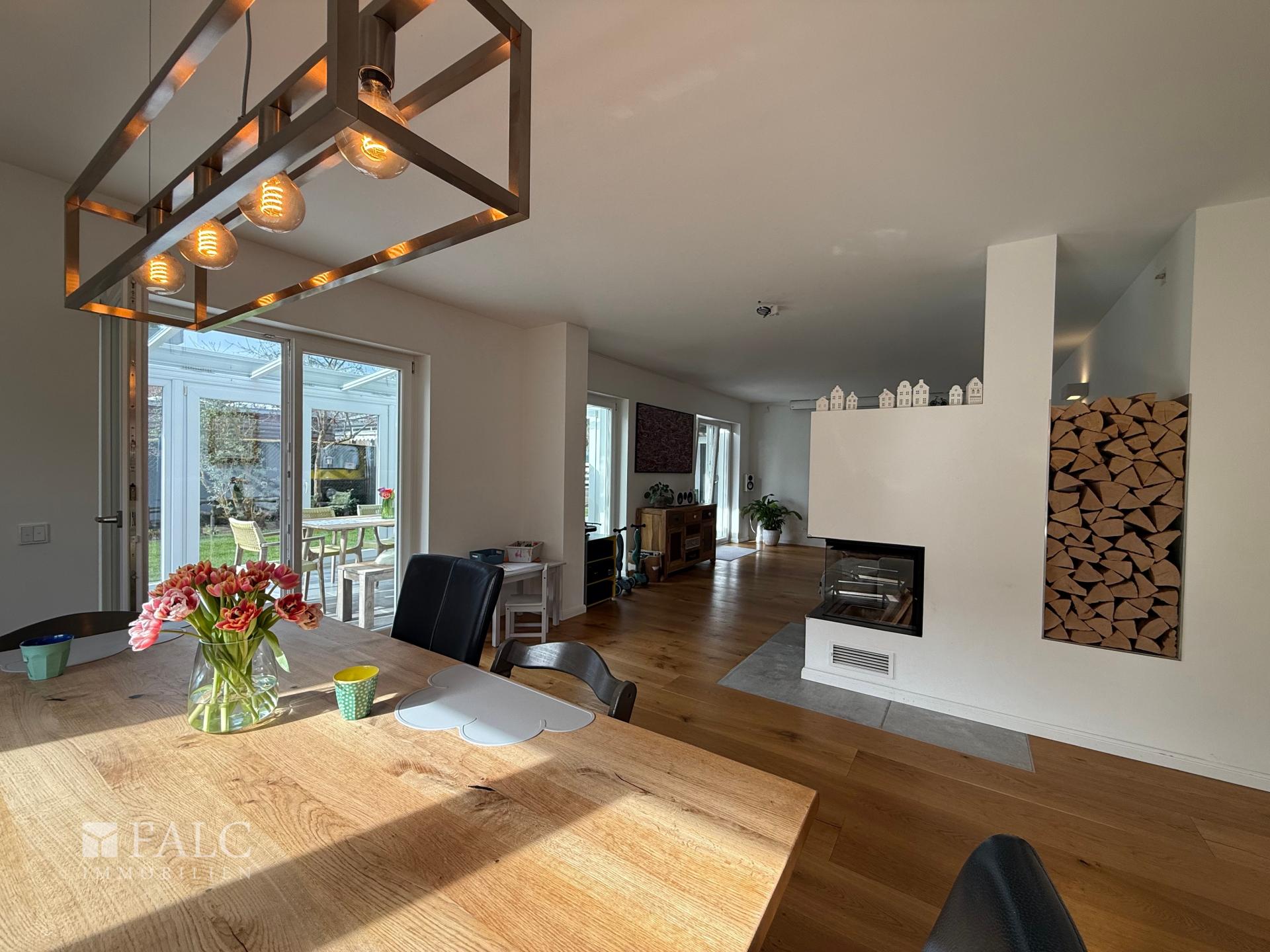 Erdgeschoss: Das Herzstück des Hauses ist der großzügige, offen gestaltete Wohn- und Essbereich, der mit edlem Parkettboden, einem modernen Kamin und einer durchdachten HiFi-Verkabelung in Wänden und Decken – inklusive Anbindung an den Terrassenbereich – sofort ein Gefühl von Qualität vermittelt. Die attraktive Einbauküche – ausgestattet mit hochwertigen Geräten von Miele und Bora – ist über eine offene Theke angebunden und macht Kochen zum Teil des Familienlebens. Große Fensterfronten mit elektrischen Rollläden lassen viel Tageslicht herein und sorgen für eine helle, angenehme Atmosphäre. Direkt angrenzend befindet sich der lichtdurchflutete Wintergarten mit Fußbodenheizung und hochwertigen Warema-Markisen, der einen fließenden Übergang zwischen Wohnraum und Garten schafft und sich zu jeder Jahreszeit als zusätzlicher Aufenthaltsbereich nutzen lässt. Ein weiteres Zimmer im Erdgeschoss lässt sich flexibel als Gästezimmer, Spielzimmer oder Homeoffice nutzen. Das Gäste-WC ist mit einer Dusche ausgestattet und damit vollwertig als zusätzliches Bad nutzbar.