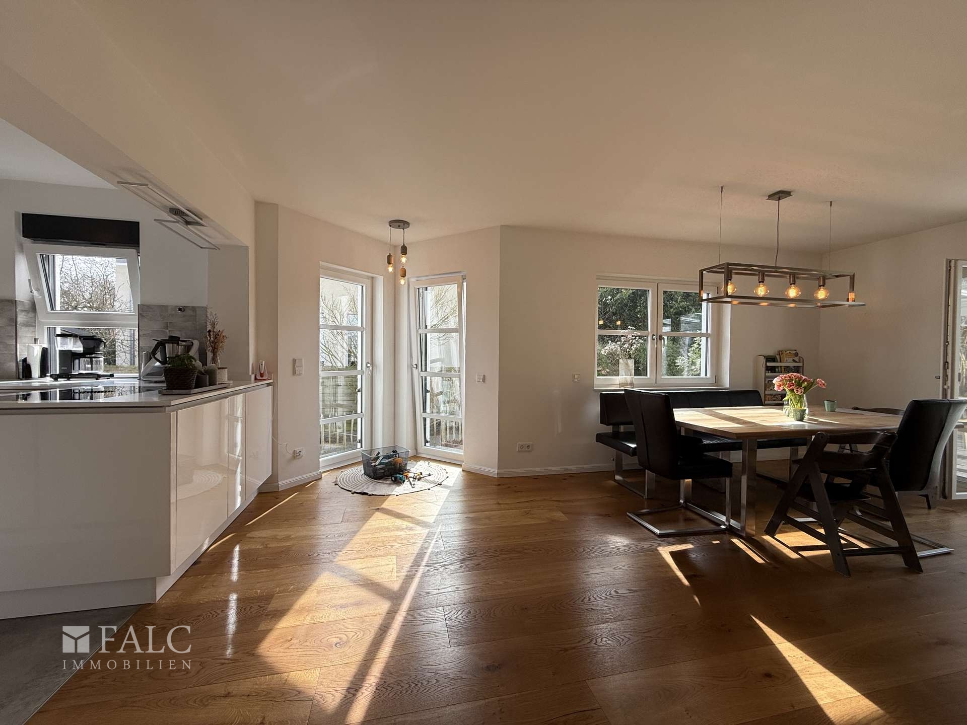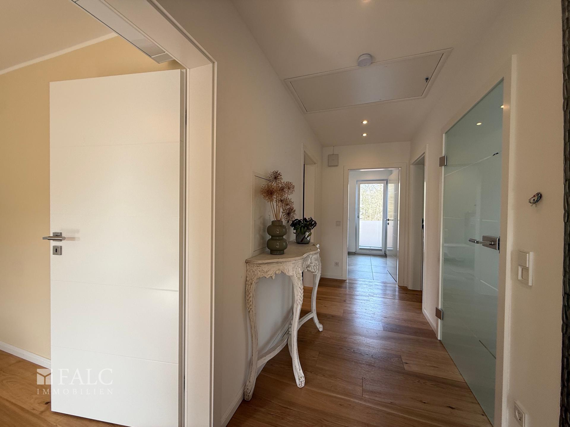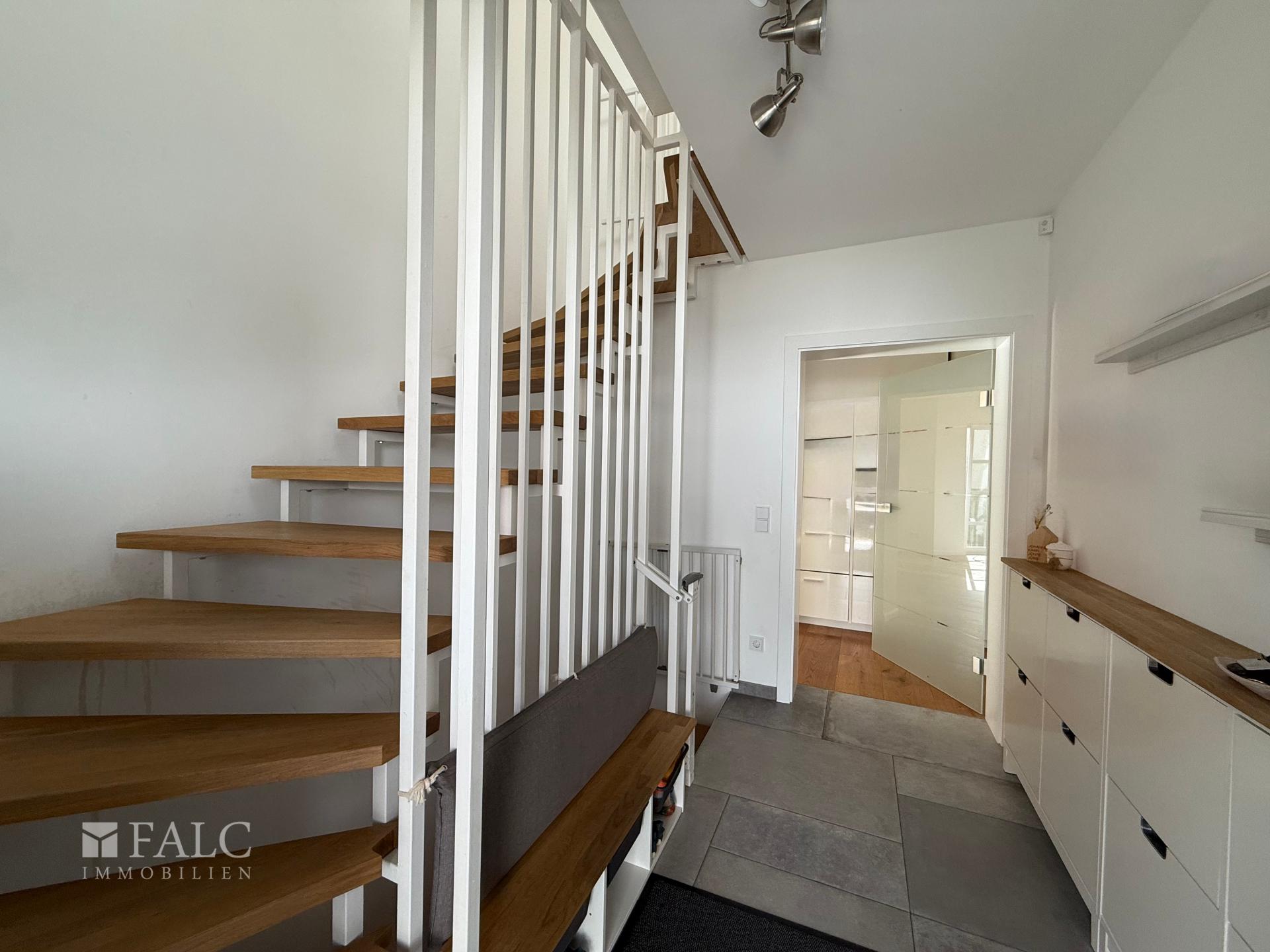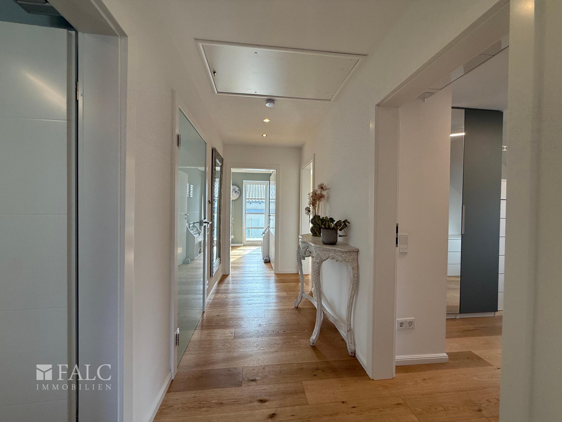 Erdgeschoss: Das Herzstück des Hauses ist der großzügige, offen gestaltete Wohn- und Essbereich, der mit edlem Parkettboden, einem modernen Kamin und einer durchdachten HiFi-Verkabelung in Wänden und Decken – inklusive Anbindung an den Terrassenbereich – sofort ein Gefühl von Qualität vermittelt. Die attraktive Einbauküche – ausgestattet mit hochwertigen Geräten von Miele und Bora – ist über eine offene Theke angebunden und macht Kochen zum Teil des Familienlebens. Große Fensterfronten mit elektrischen Rollläden lassen viel Tageslicht herein und sorgen für eine helle, angenehme Atmosphäre. Direkt angrenzend befindet sich der lichtdurchflutete Wintergarten mit Fußbodenheizung und hochwertigen Warema-Markisen, der einen fließenden Übergang zwischen Wohnraum und Garten schafft und sich zu jeder Jahreszeit als zusätzlicher Aufenthaltsbereich nutzen lässt. Ein weiteres Zimmer im Erdgeschoss lässt sich flexibel als Gästezimmer, Spielzimmer oder Homeoffice nutzen. Das Gäste-WC ist mit einer Dusche ausgestattet und damit vollwertig als zusätzliches Bad nutzbar.