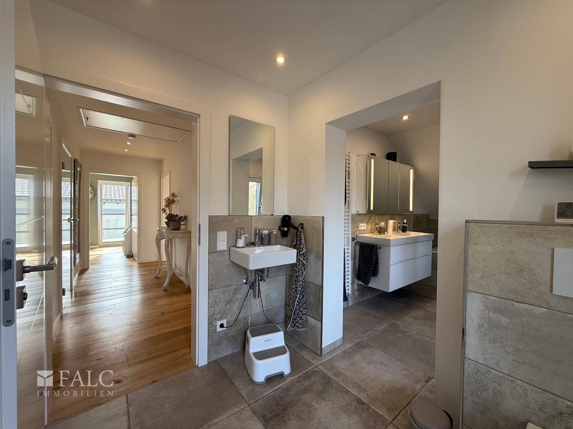 Familienbad im OG mit getrenntem WC und großzügigem Dusch- und Wannenbereich, hochwertig ausgestattet