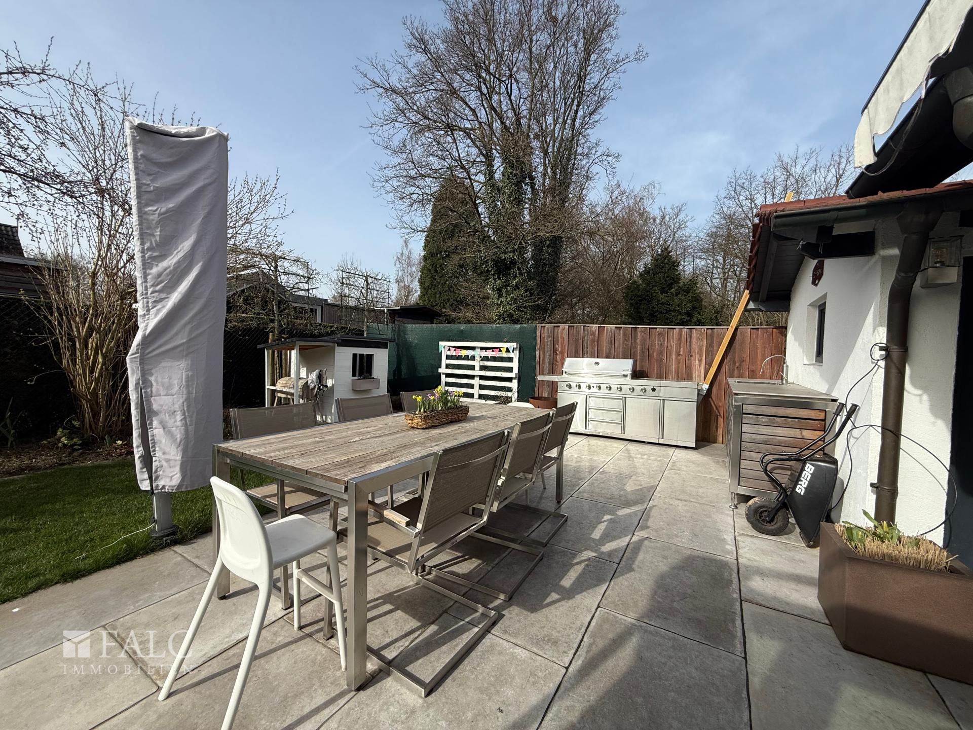 Gepflegte Terrasse mit großzügiger Freisitzfläche und Anschlüssen für eine Außenküche