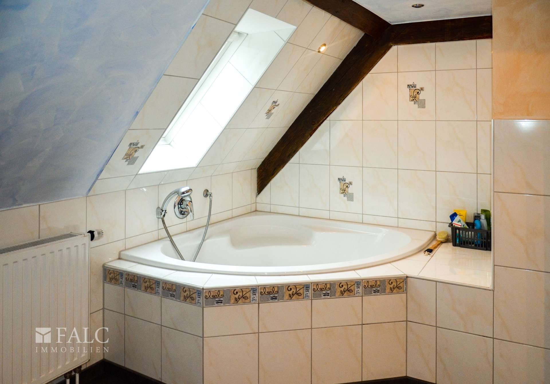 - Modernisierte Badezimmer mit Dusche/Wanne, hellen Fliesen und Badheizkörpern
