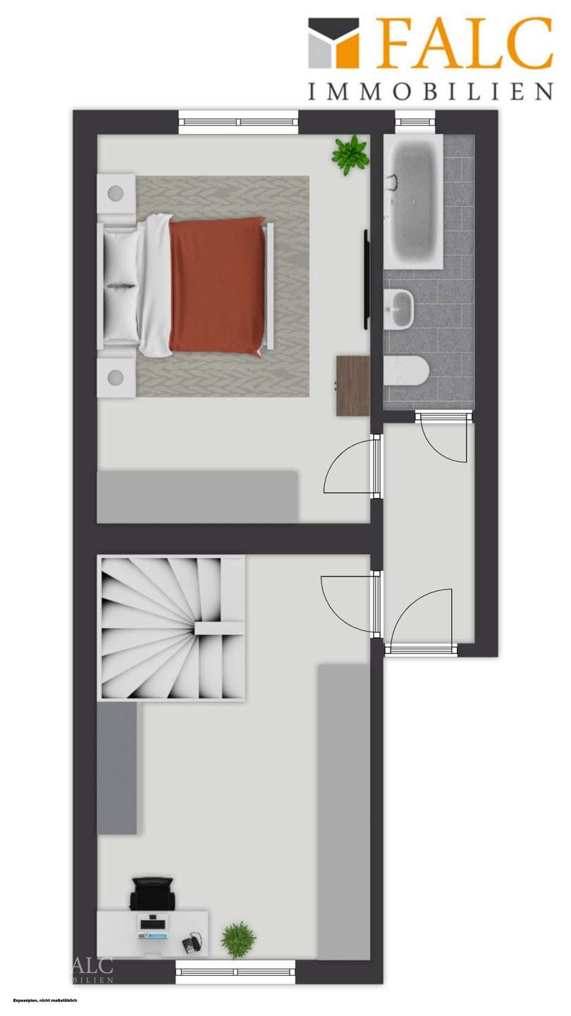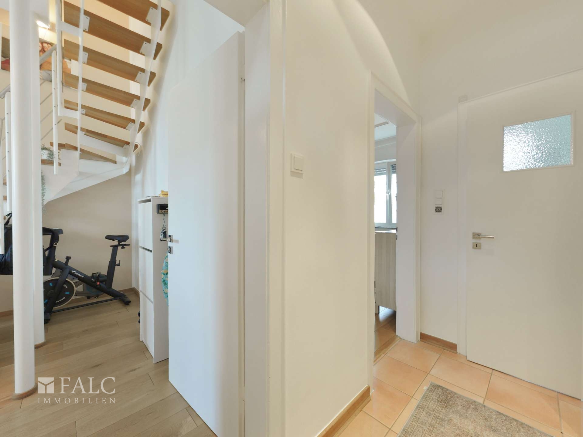 Im Erdgeschoss befindet sich ein modernes Bad und die große Küche mit moderner und komplett ausgestatteter Design-Einbauküche und schönem Sonnenbalkon: Das ist mal eine richtige Wohnküche! Gleich nebenan das helle Büro mit der Treppe nach oben ins gemütliche Wohnzimmer. Das Obergeschoss überzeugt darüber hinaus mit großem Schlafzimmer und dem zweiten Badezimmer!