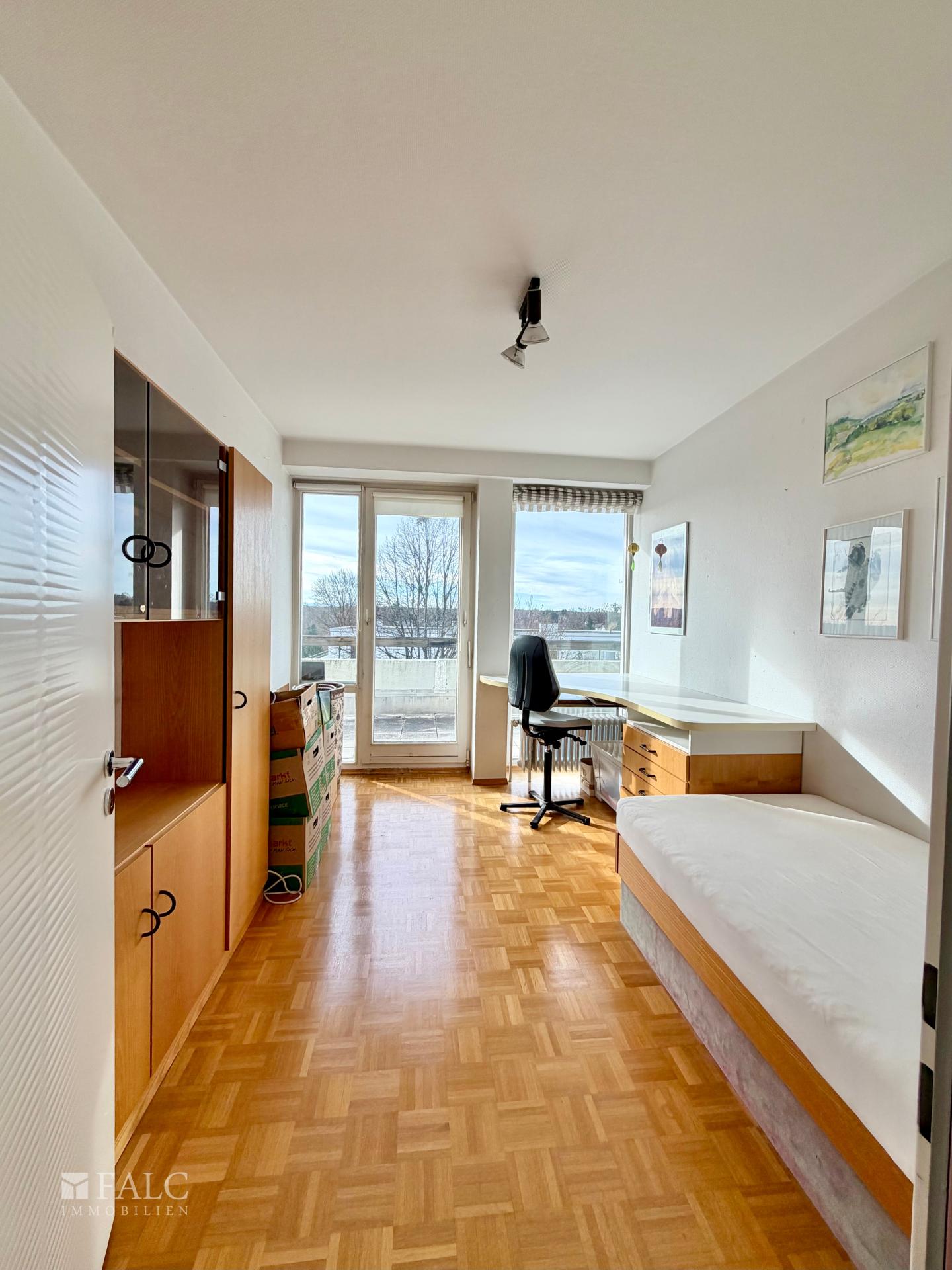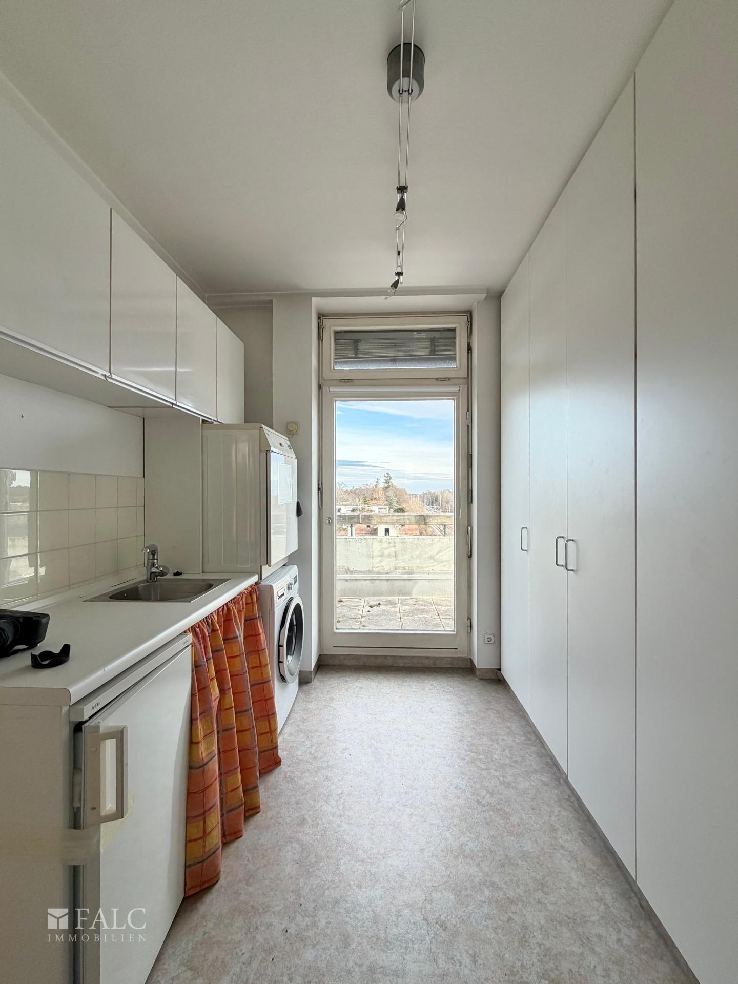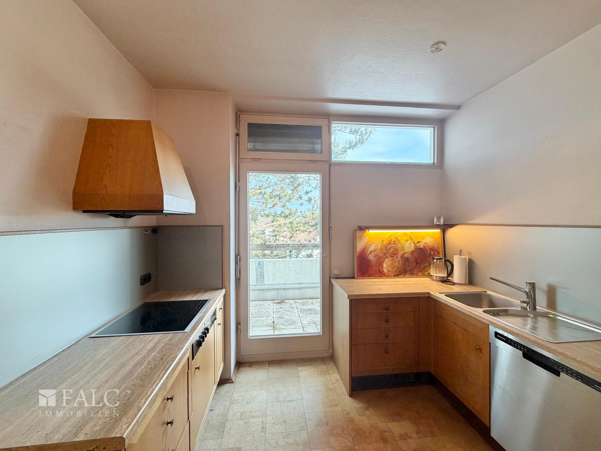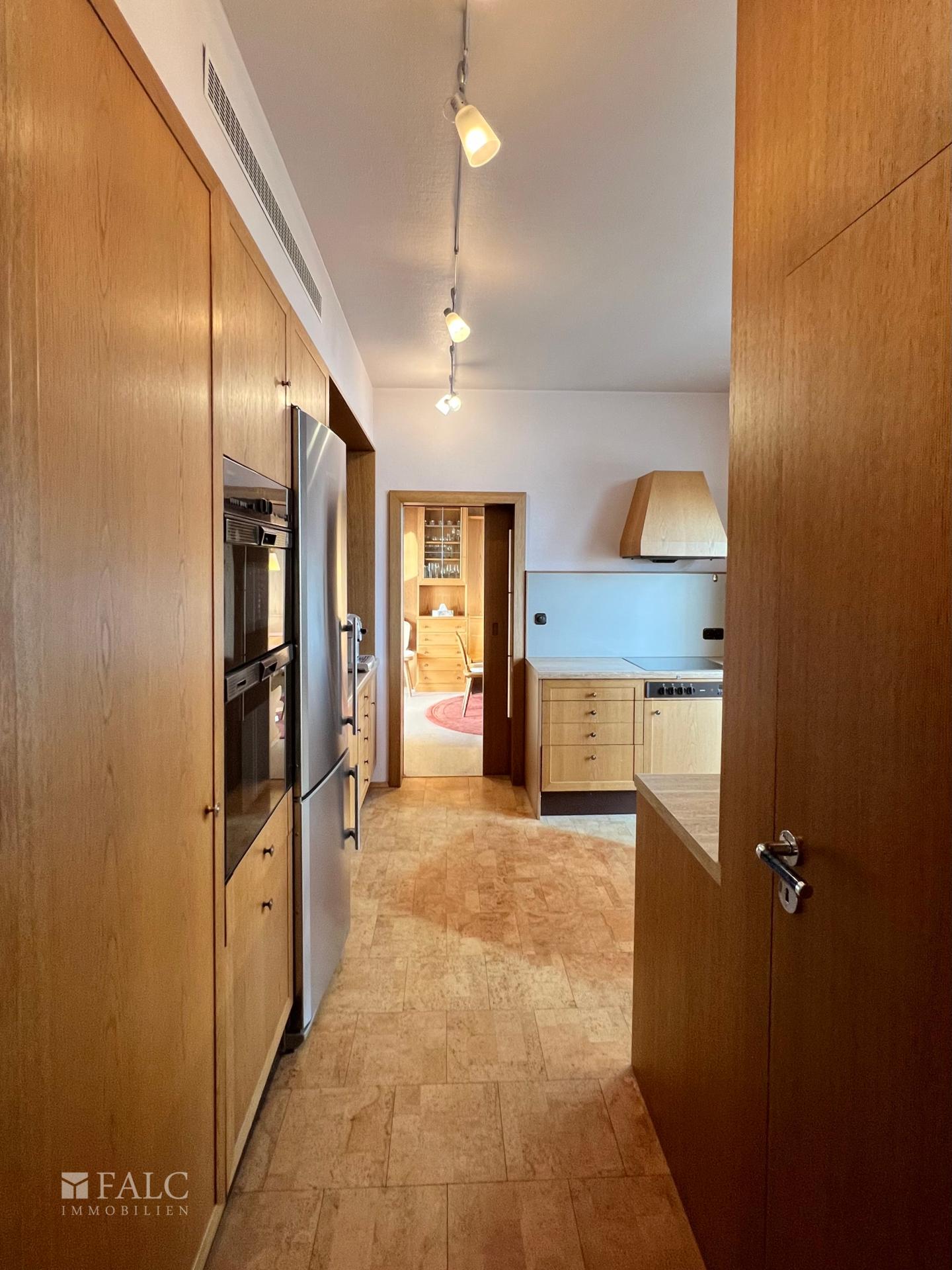 Die Küche liegt unmittelbar am Essbereich und kann über eine Schiebetür separat abgetrennt werden. Sie verfügt über eine praktische Vorratskammer und bietet Zugang zu einem eigenen, nach Norden ausgerichteten Balkon, der sich ideal für entspannte Morgenstunden oder als angenehmer Rückzugsort an warmen Tagen eignet.