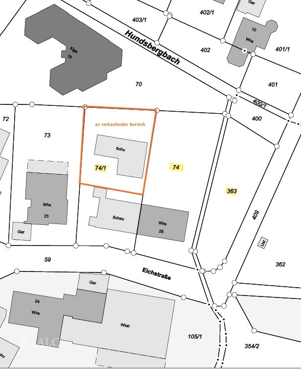- Grundstück 3: ca. 950 m² (ehemaliges landwirtschaftliches Anwesen auf Flurstücken 74 & 74/1)