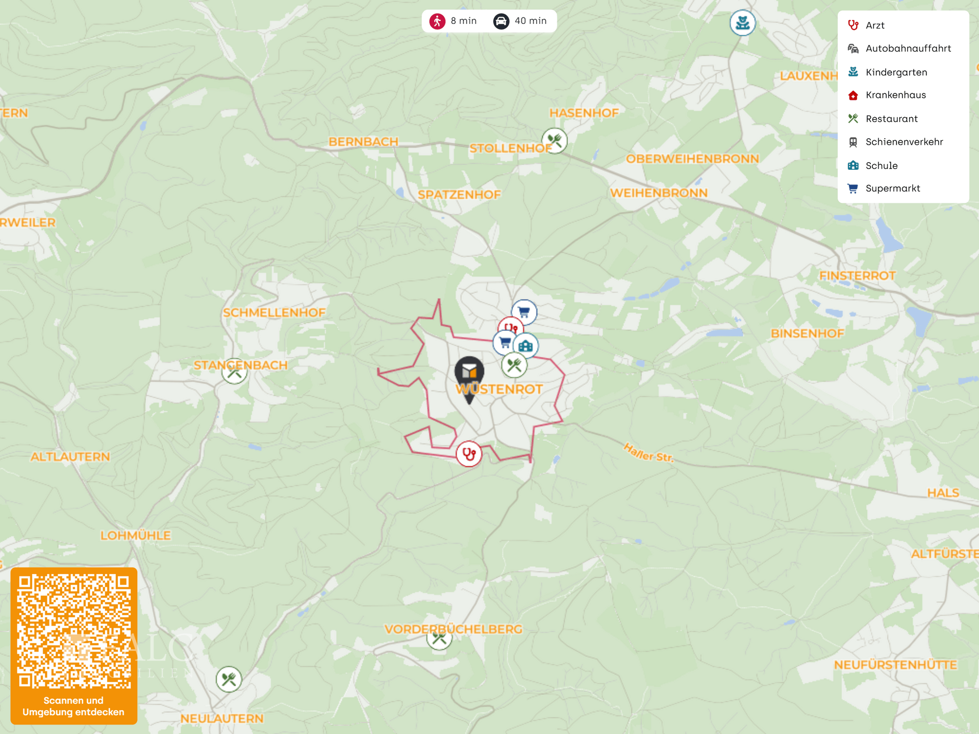 Die Versorgungseinrichtungen des täglichen Bedarfs – darunter Supermärkte, Bäckerei, Apotheke und Gastronomie – befinden sich im Ortszentrum von Wüstenrot, das in wenigen Minuten erreichbar ist. Kindergärten, Schulen sowie öffentliche Einrichtungen sind ebenfalls gut angebunden.