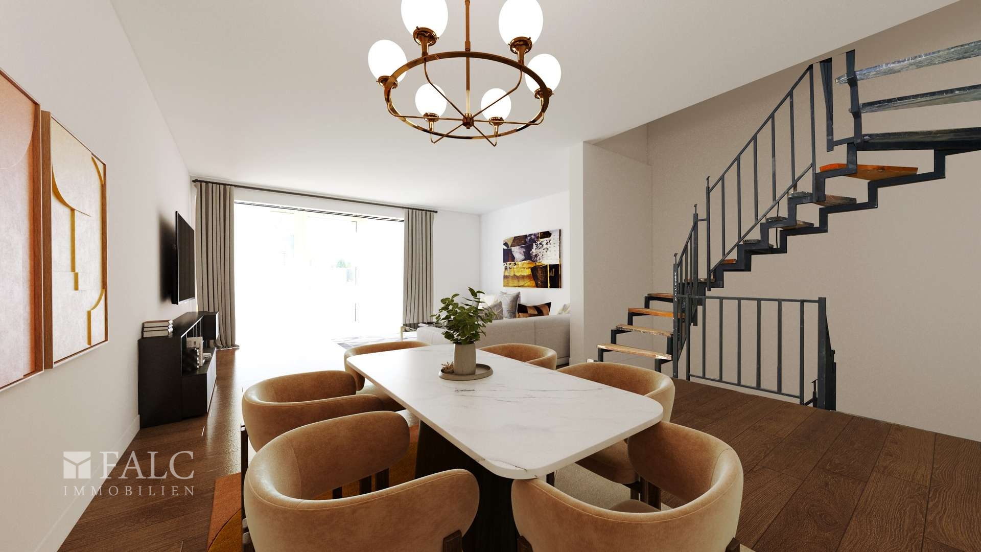 Beim Betreten des Hauses werden Sie im Erdgeschoss von einer einladenden Diele empfangen, die genügend Platz für eine Garderobe und ein Schuhregal bietet. Direkt zur Rechten befindet sich ein praktisches Gäste-WC, bevor Sie weiter in den großzügigen, offenen Wohn- und Essbereich mit einer offen-gestalteter Küche gelangen. Dieser Raum ist das Herzstück der Immobilie und bietet reichlich Platz für eine moderne Küche, eine gemütliche Essecke sowie einen behaglichen Wohnbereich. Ideal für gesellige Abende mit Familie und Freunden. Der direkte Zugang zur Terrasse und zum Garten sorgen für zusätzlichen Komfort ins Freie.